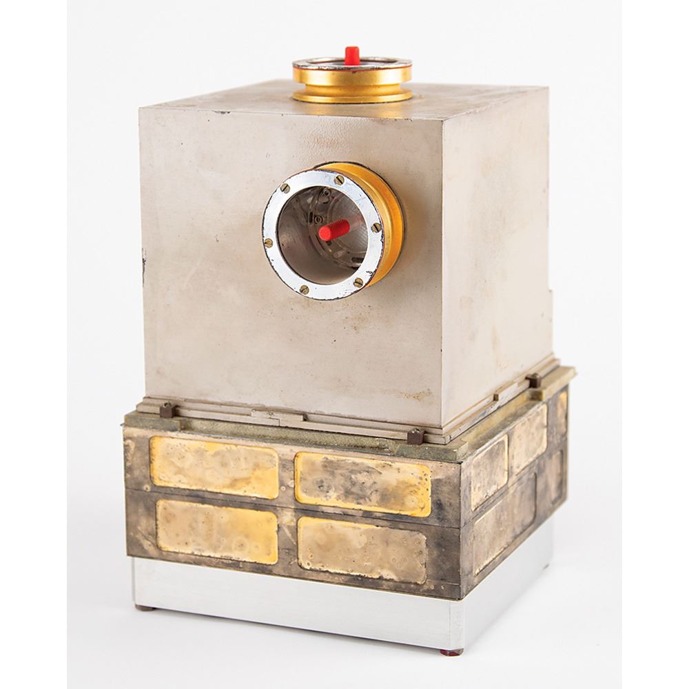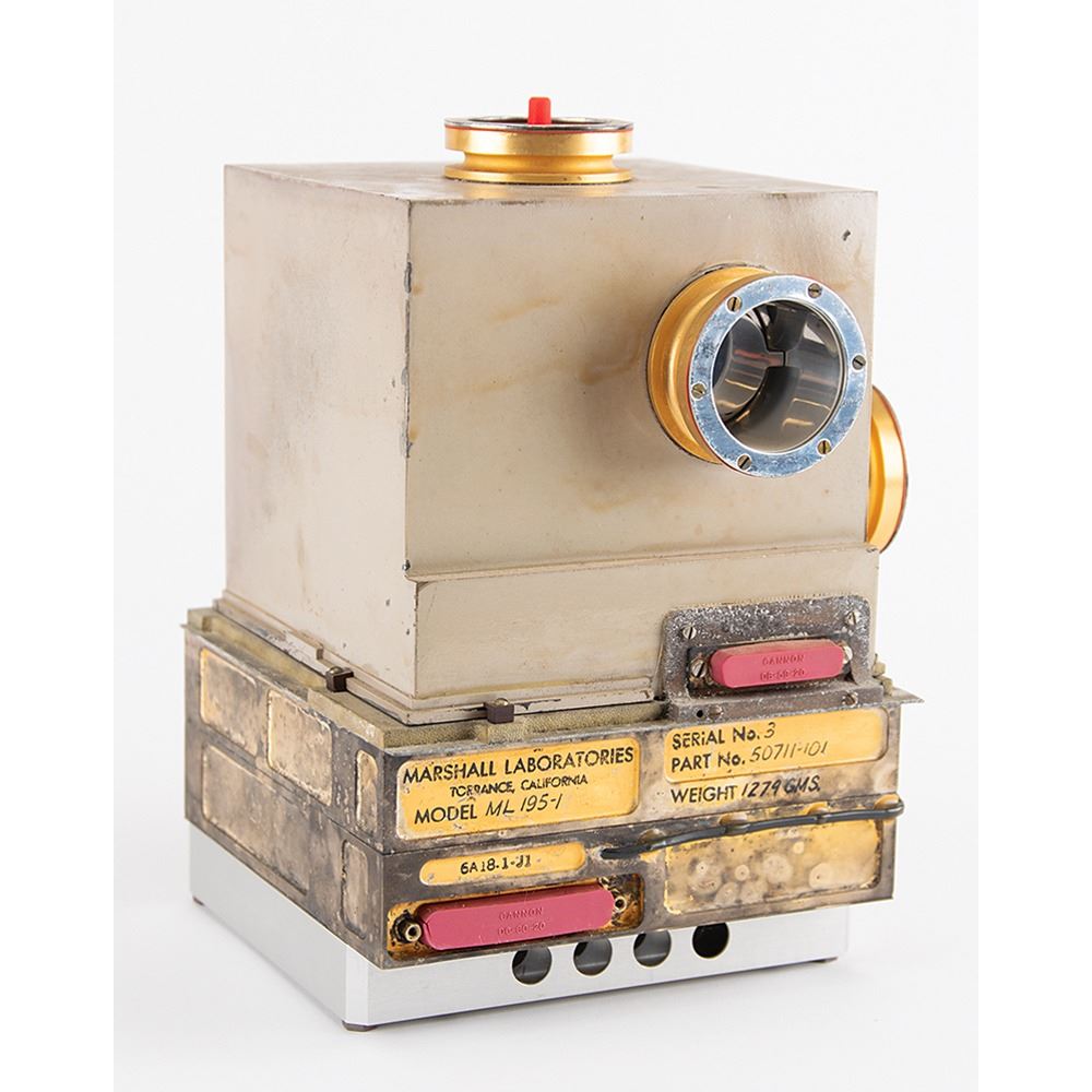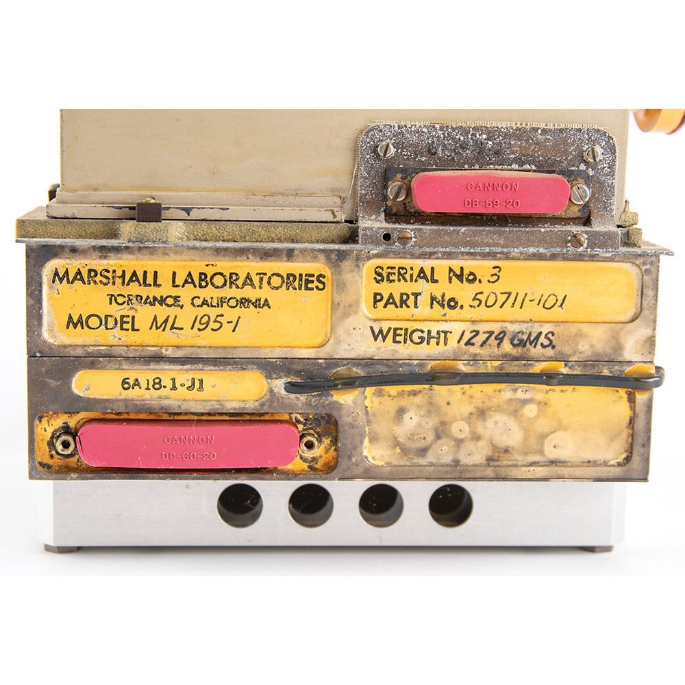 Otto Berg's flight spare of a cosmic dust detector experiment built for the Interplanetary Monitoring Platforms (IMP-D and IMP-E) carried on Explorer 33 and Explorer 35. The unit measures 8Àù x 10Àù x 6.5Àù and features a sensor system in four different axes, with electrical ports on one side of the housing. The device is labeled: "Marshall Laboratories, Torrance, California, Model ML195-1, 6A18-1-J1, Serial No. 3, Part No. 50711-101, Weight 1279 GMS." In fine condition.