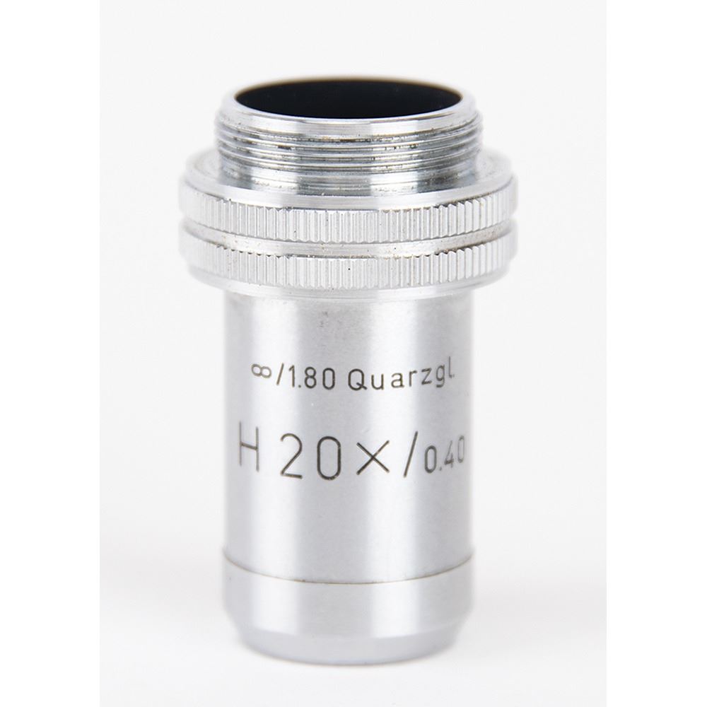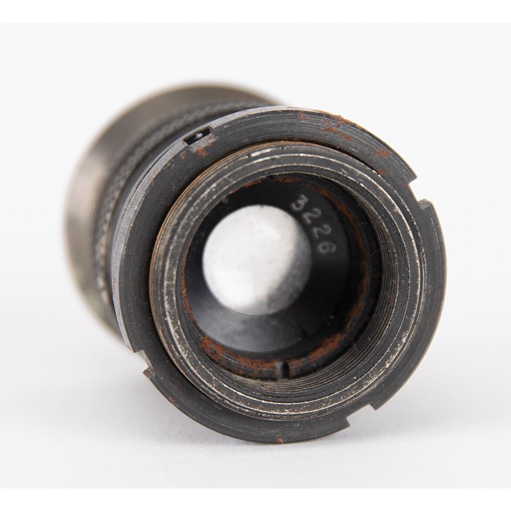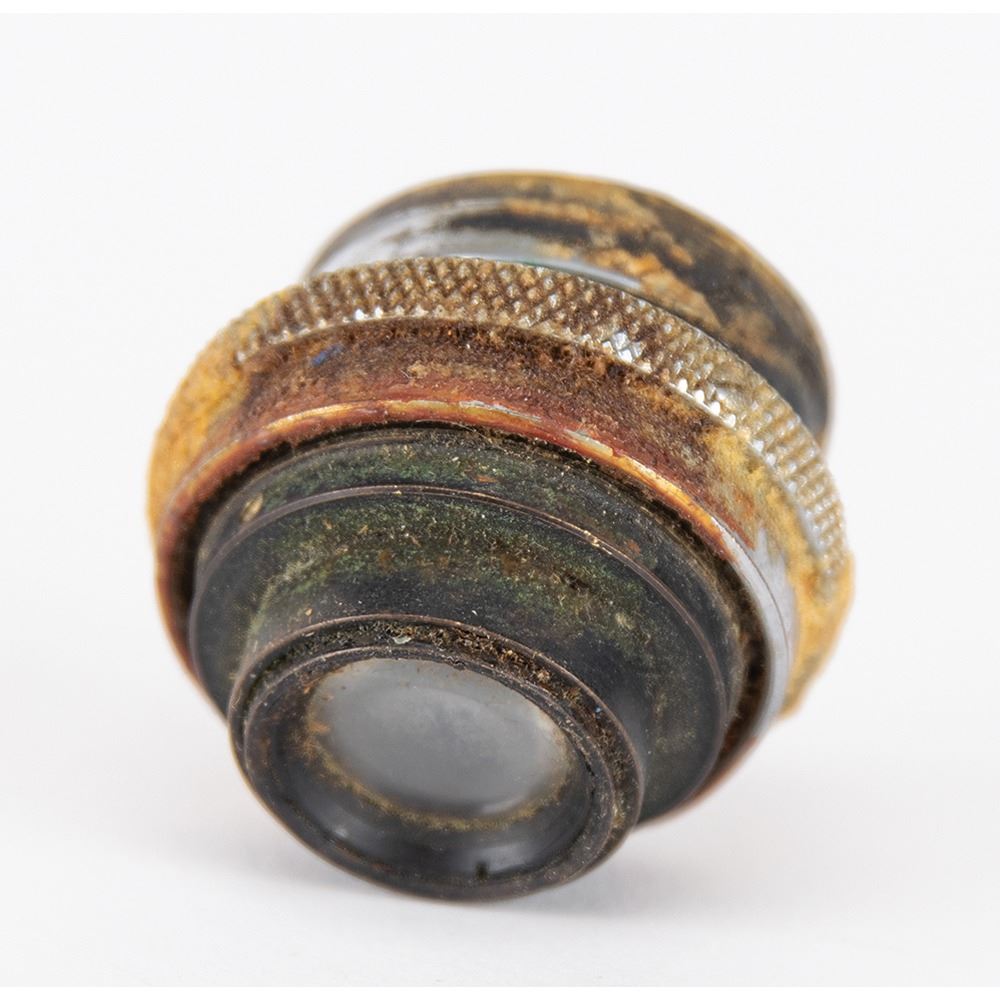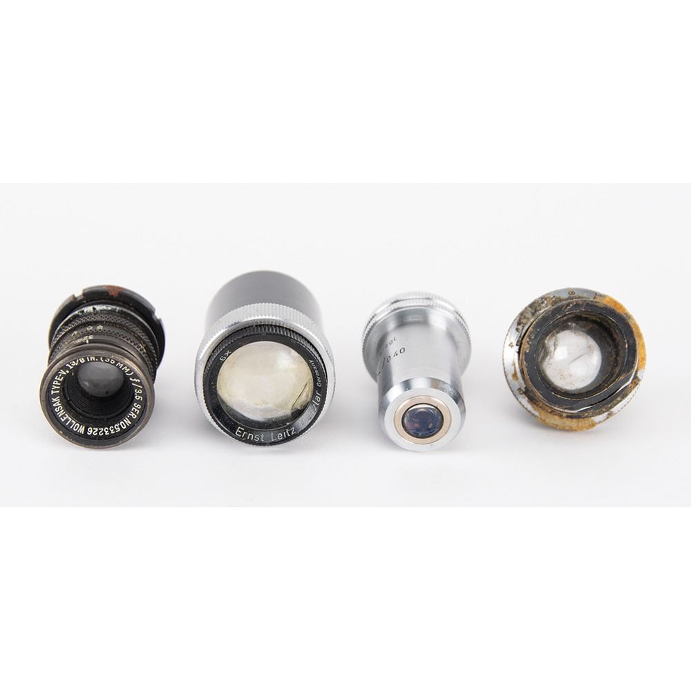 Four small lenses from the collection of Otto Berg, including: a Leitz H20 X/0.40 microscope lens; an Ernst Leitz 6x microscope lens; a Wollensak 35mm F/3.5 Type V camera lens; and an unknown small camera lens. In overall good to very good condition, with damage to the Ernst Leitz 6x and the unknown camera lens.