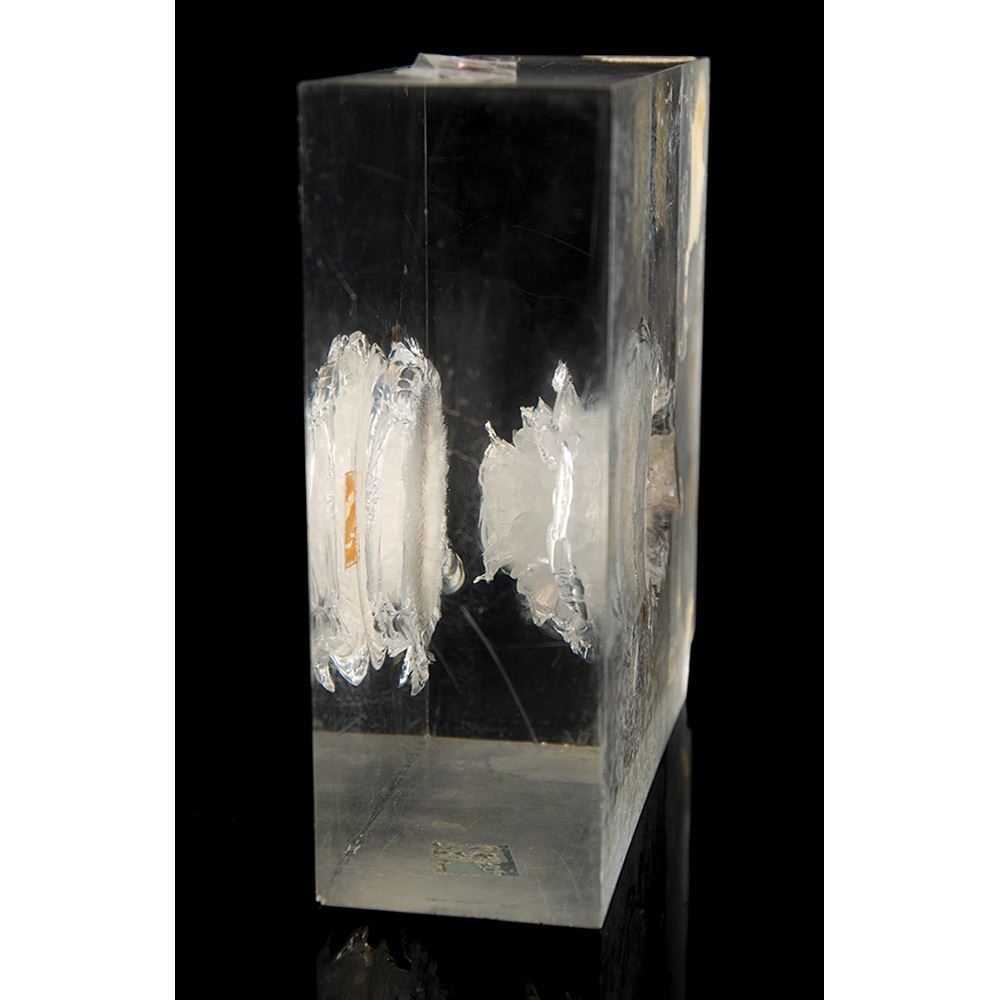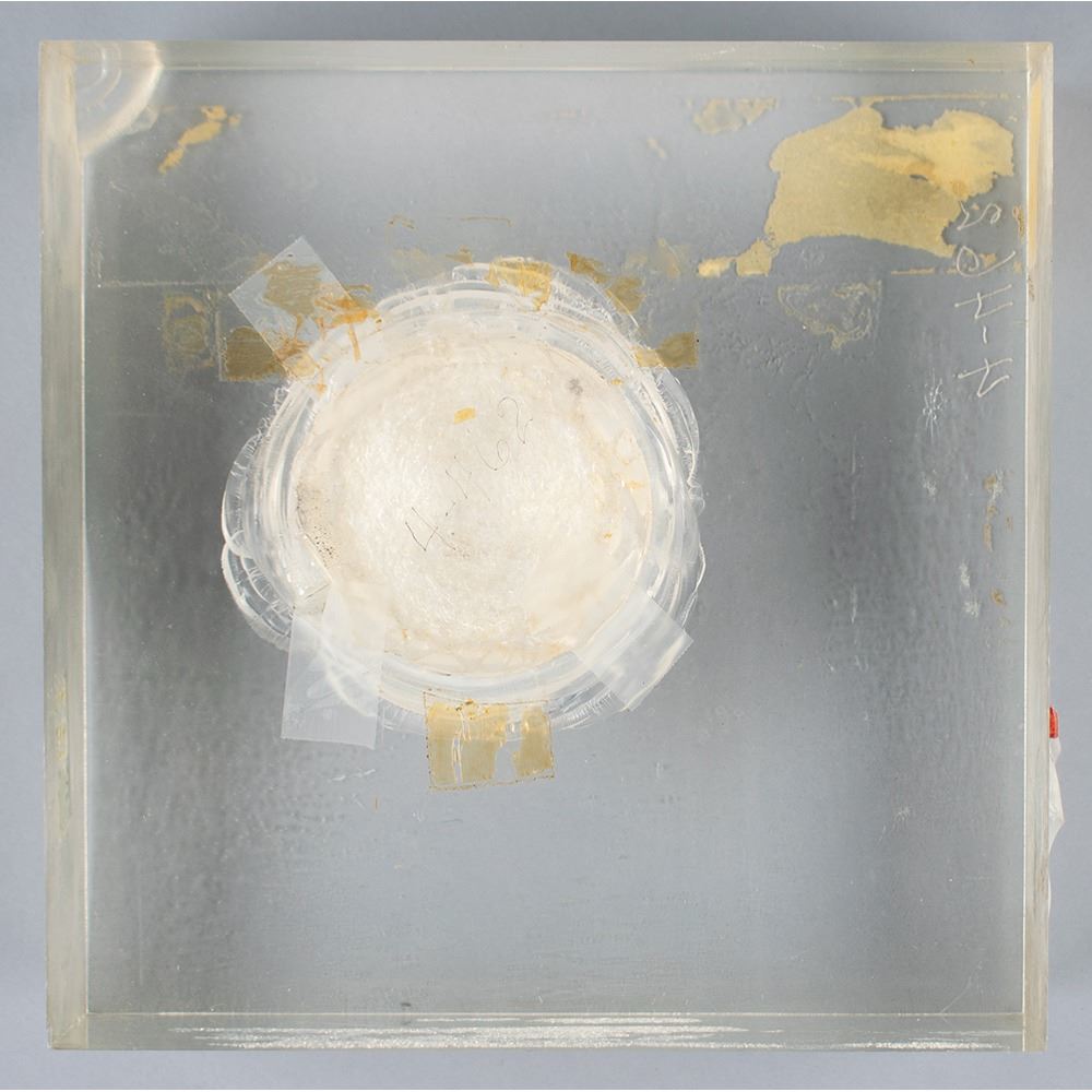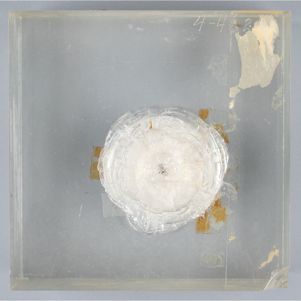 Impressive block of lucite demonstrating the effects of a hypervelocity impact of a micrometeoroid traveling at speeds of about 20,000 feet per second, or five miles per second. The block measures 8Àù x 8Àù x 3Àù and was impacted at the center by a tiny nylon disc (3/8Àù in diameter and 1/32Àù thick, a sample of which is taped to the top) resulting in substantial ballistic damage to the block and a circular spall broken off the back from the ultra high-speed impact. Traveling faster than the speed of sound, the disc precedes the shockwave momentarily and the resulting shock wave and energy from the projectile combine to knock out a spall on the far side. The block is etched in the upper right corner: "4-462." In very good to fine condition, with a chip to one corner of the block and the spall fragment reattached to the back with tape.