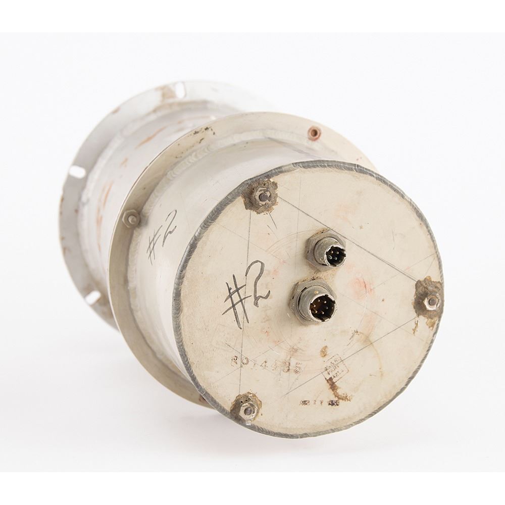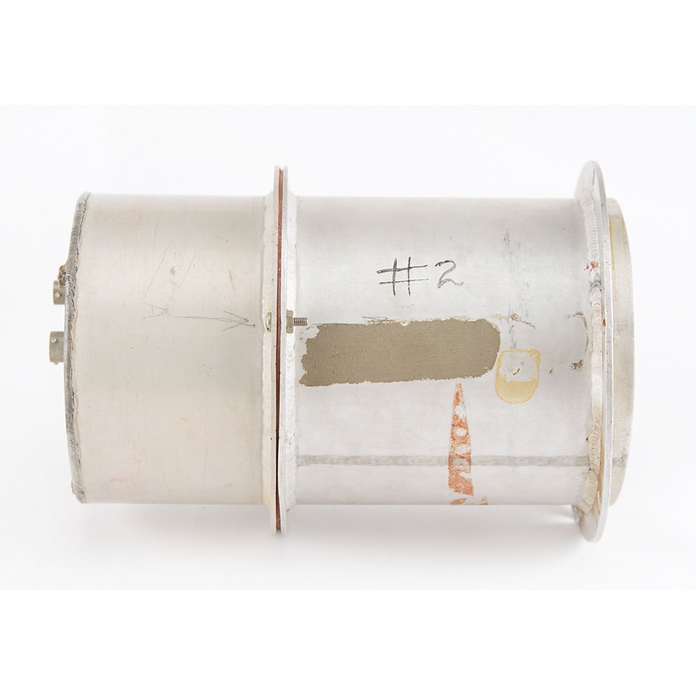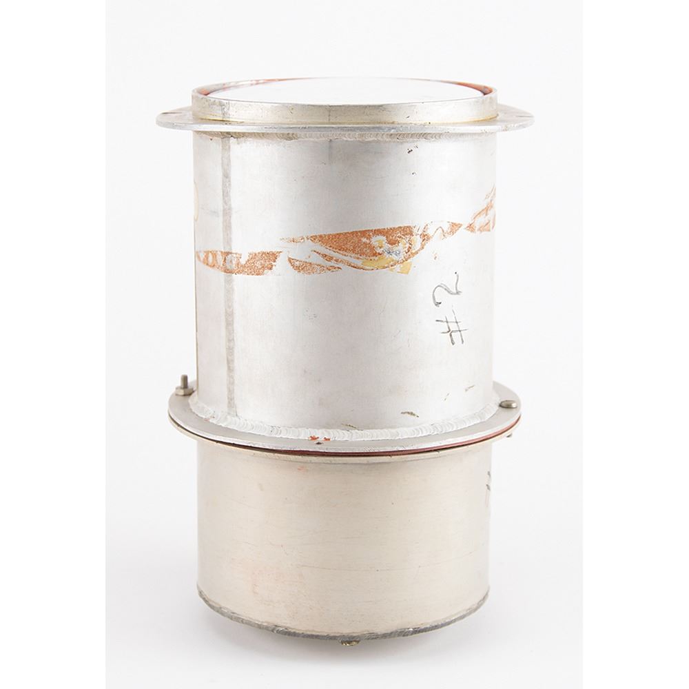 Otto Berg's flight spare of a cosmic dust detector experiment built for Wernher von Braun's Jupiter-C research and development launch vehicle, identical to the unit actually carried as part of the experiments package on a Jupiter-C launch. The device measures approximately 7˝ in diameter and 10.5˝ long, and features a mirrored circular sensor at one end, with electrical connector ports at the other. The sensor features three layers of material—two titanium layers separated and insulated by a silicon oxide layer—upon a quartz cone, each layer being about one-millionth of an inch thick. There is voltage between the two conducting layers and when a particle of cosmic dust—whizzing through space at 40,000 miles per hour—hits the surface, it momentarily causes a short in the circuit and initiates a signal. The housing of this spare unit is marked in black ink, "#2." In fine condition. Berg holds the patent for this type of 'capacitor sensor' (U.S. Patent No. 3,307,407), and the system formed the basis for the Lunar Ejecta and Meteorites (LEAM) experiment deployed on the lunar surface on Apollo 17, as well as for cosmic dust sensors on the Pioneer 8 and Pioneer 9 sun-orbiting space probes.