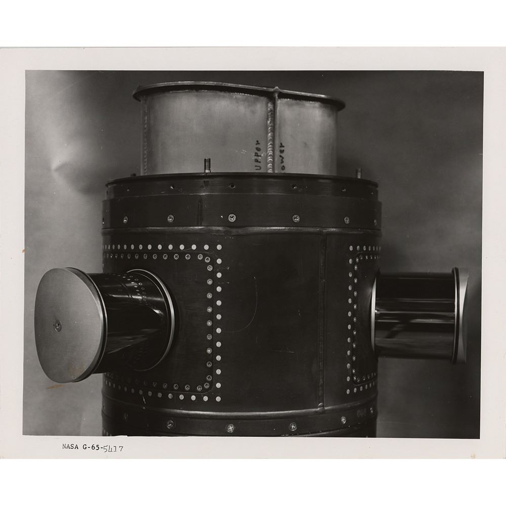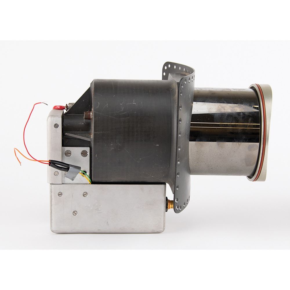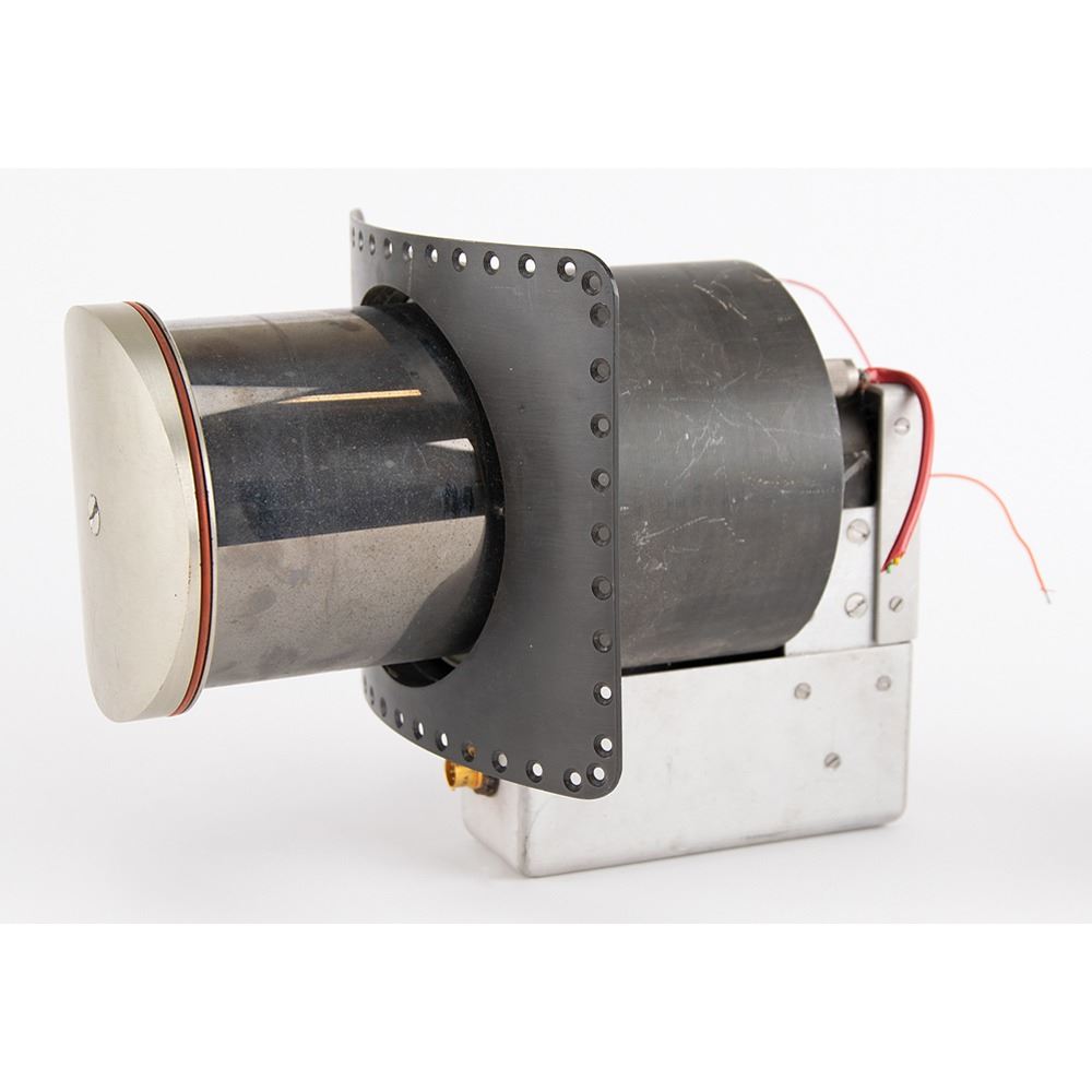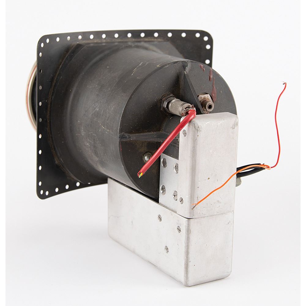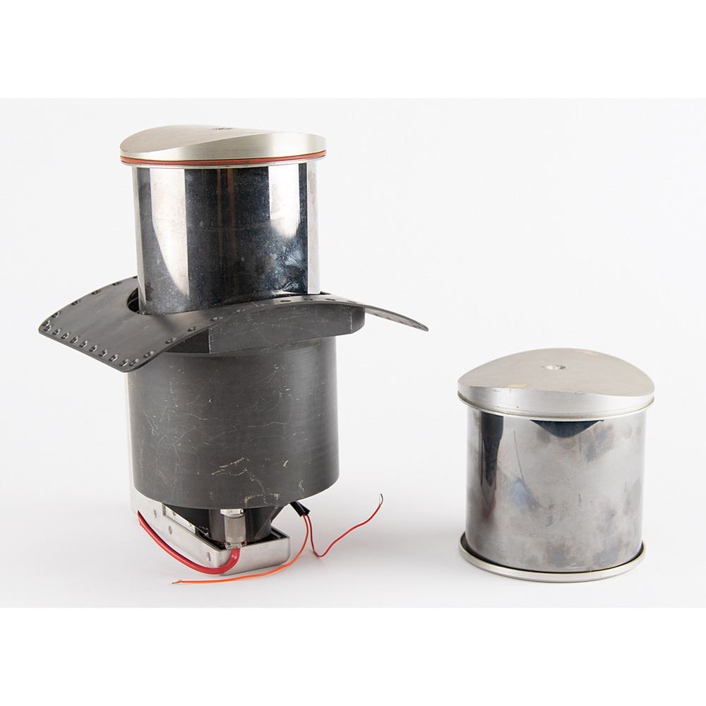 Otto Berg's early micrometeoroid experiment designed for use on an Aerobee rocket, measuring approximately 8Àù x 11Àù x 8Àù, featuring a polished cylindrical sensor within a black housing, attached to an electronics box. Includes a spare example of the hollow cylindrical sensor, measuring 5Àù tall and 5Àù in diameter. Berg discusses the experiment in his notes: "This was an early attempt to register impacts from meteorites hitting a polished surface. Four of these were extended outward from an Aerobee rocket after launch and then cranked back into a protective cover before impact. The rocket carrying this experiment was launched from Wallops Island and parachuted to Earth and sea-recovered. I was project scientist for two of these missions. These rocket experiments were flown early and prior to my Pioneer experiments which proved that there was no real hazard from meteoric debris. My Pioneer experiments showed that the meteor hazard was less than 1/10,000,000th the hazard which some Russians and some Americans had claimed and therefore it became reasonable for the astronauts to step outside the spacecraft." Includes an original vintage glossy photograph of the complete experiment package. In overall fine condition.