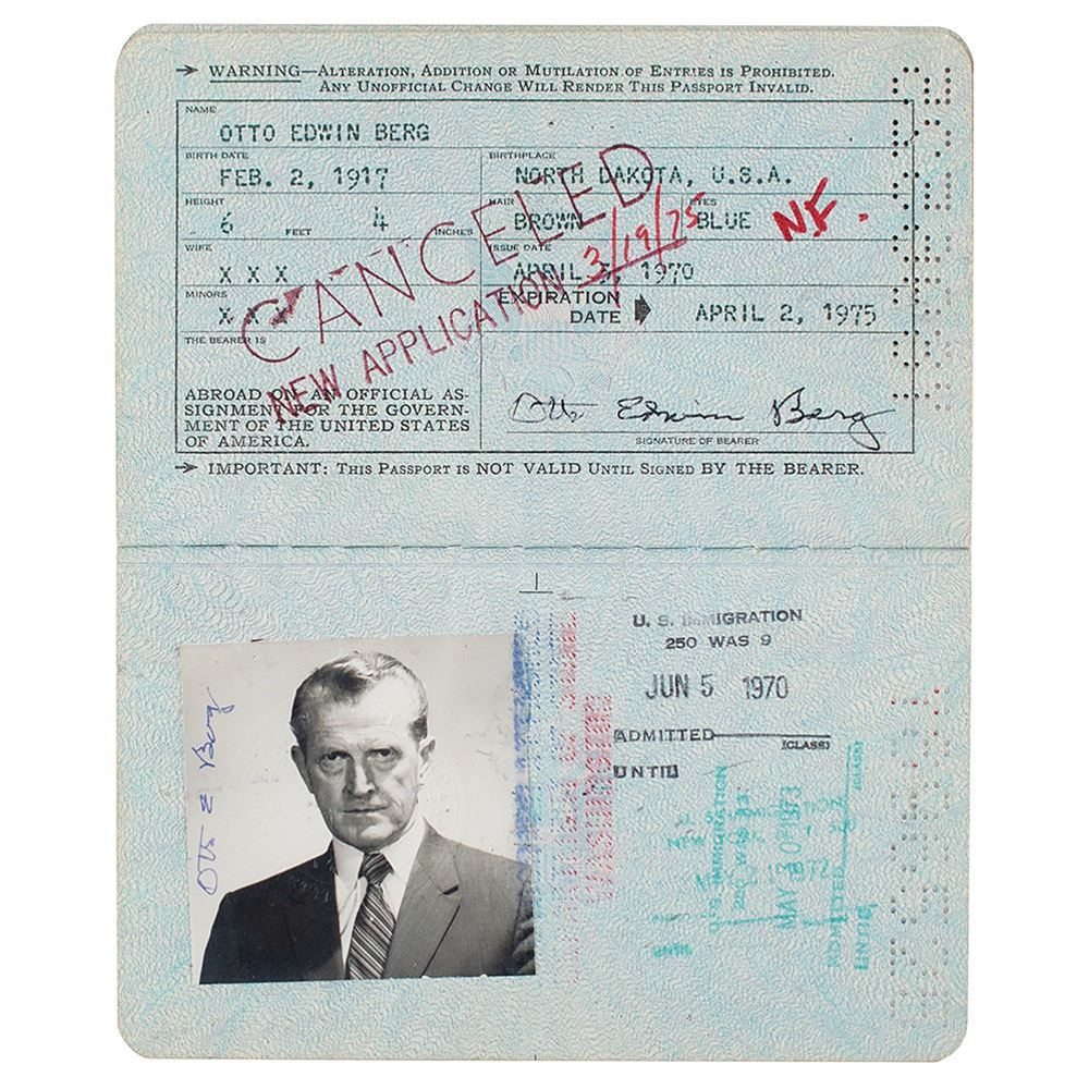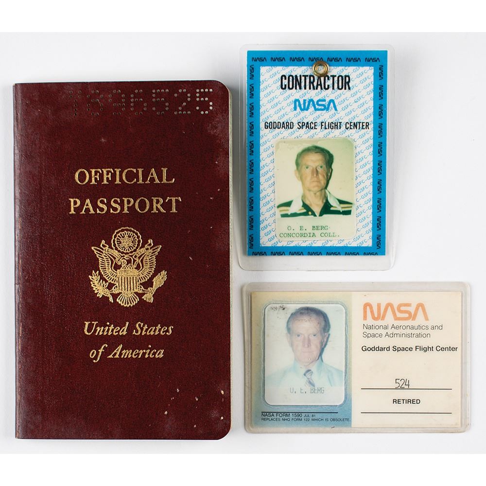 Three of Otto Berg's personal identification items: a NASA Goddard Space Flight Center "Contractor" badge; a NASA Goddard Space Flight Center "Retired" badge issued in August 1977; and a United States passport issued to Berg in 1970, featuring his photo affixed inside, signed along the edge in blue ballpoint, "Otto E. Berg," and also signed on the adjacent page in black ballpoint, "Otto Edwin Berg." In overall fine condition.