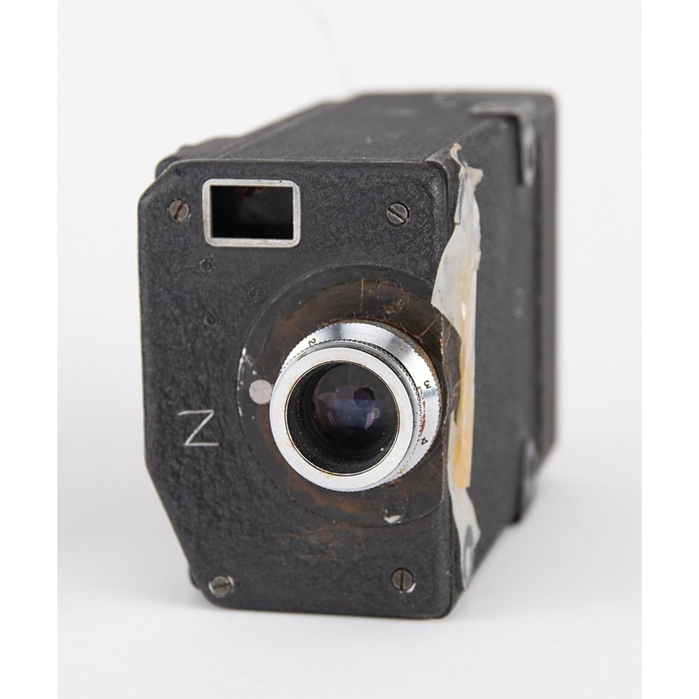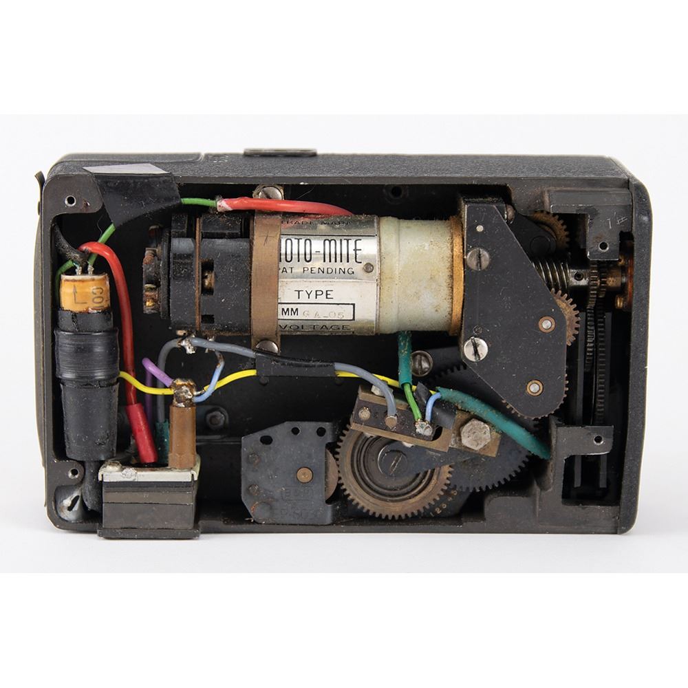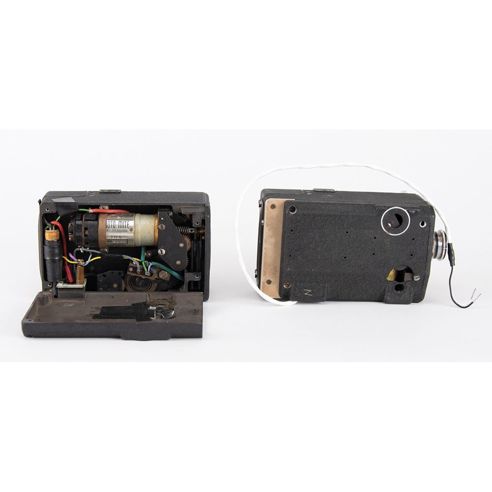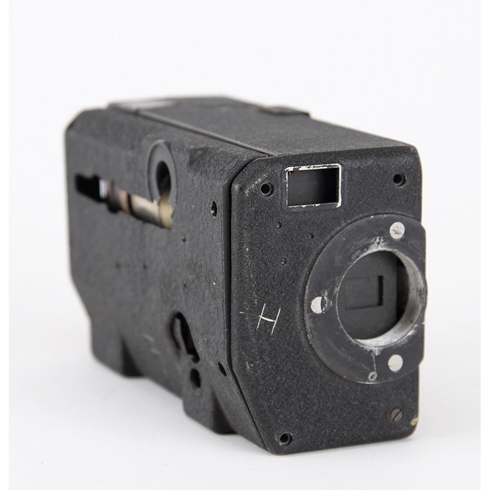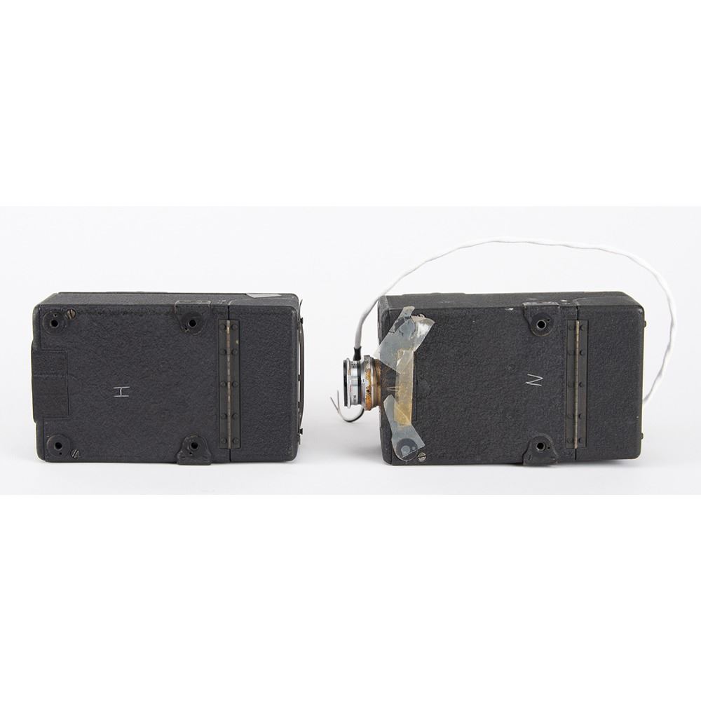 Two original 16mm motion picture cameras modified for use on Aerobee rockets from the collection of Otto Berg, described in his notes as flight spares of the camera he designed and flew aboard an Aerobee-hi rocket on October 5, 1954, which captured the imagery used for his famous photomosaic of Earth. These are evidently modified Bell & Howell Co. Model N6A gun sight aim point (GSAP) cameras, traditionally used by the US Navy for gunnery training. One unit, marked "N," retains its lens and has power wires exposed; the other camera, marked "H," is missing the lens and screws used for a housing plate, and has a port for power. In overall very good condition.