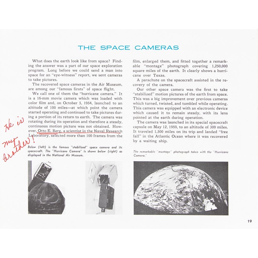Accompanied by a booklet entitled "Masters of Space," published by the Smithsonian Institution, discussing Berg's work with space cameras. The 16mm movie camera was loaded with color film and shot into space aboard a US Navy Aerobee-Hi sounding rocket from White Sands, New Mexico, on October 5, 1954. At about 100 miles high, the rocket's cameras captured the first natural-color images of the Earth successfully taken from a high-altitude rocket. Using this imagery, Otto Berg, then a scientist with the Naval Research Laboratory, selected more than 100 frames from the film, enlarged them, and fitted together a remarkable 'montage' photograph. The resulting photomosaic, which clearly shows a hurricane over the state of Texas, became a popular and enduring image of this early era of space exploration.