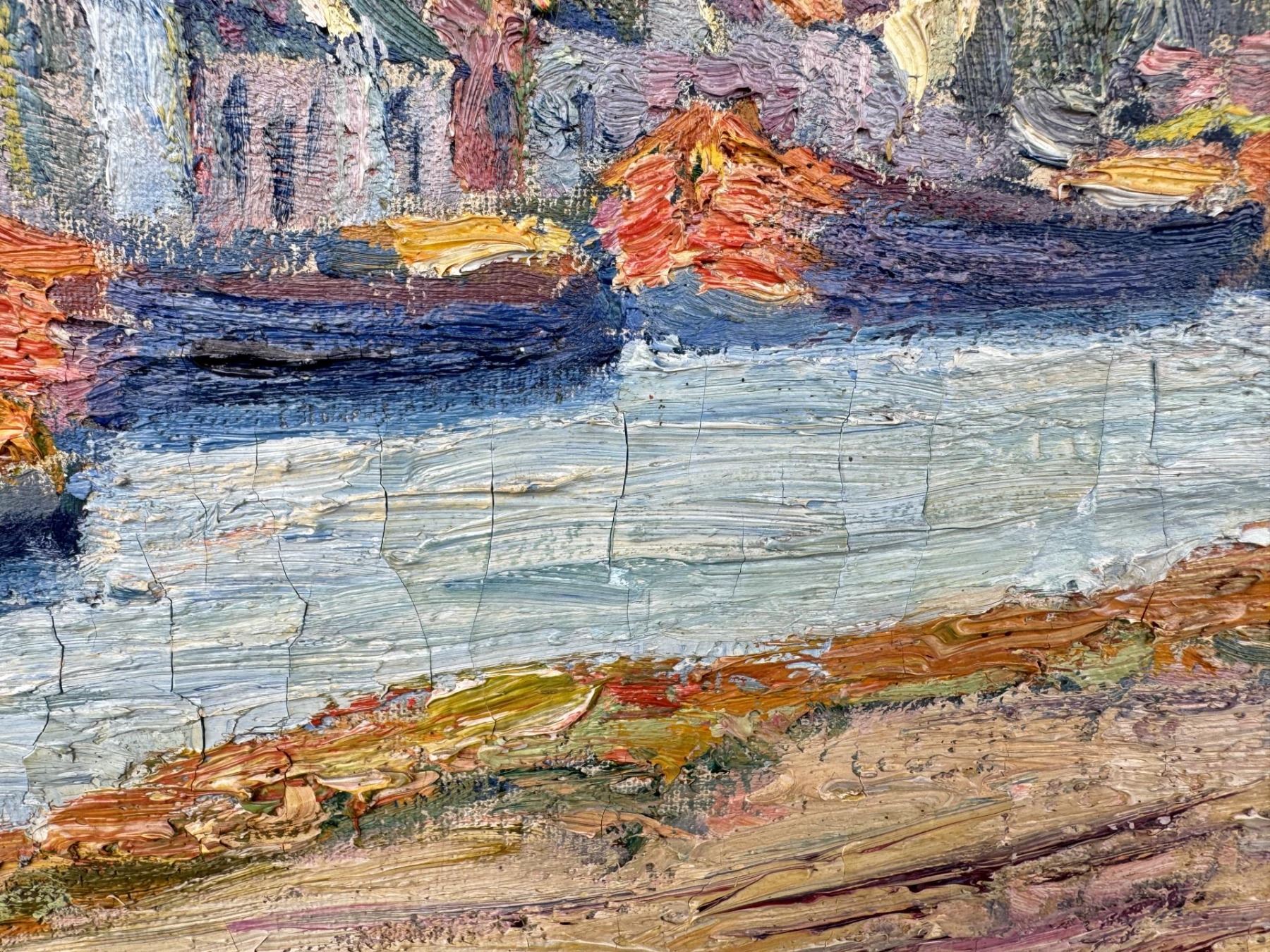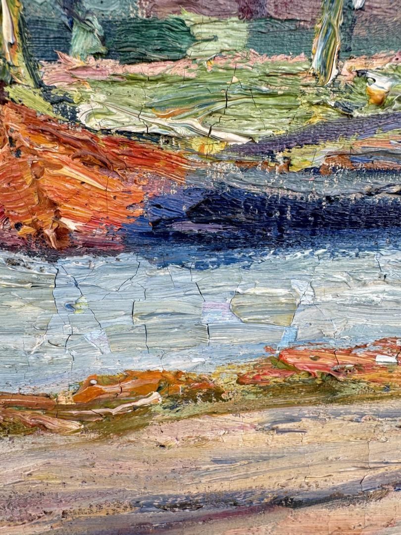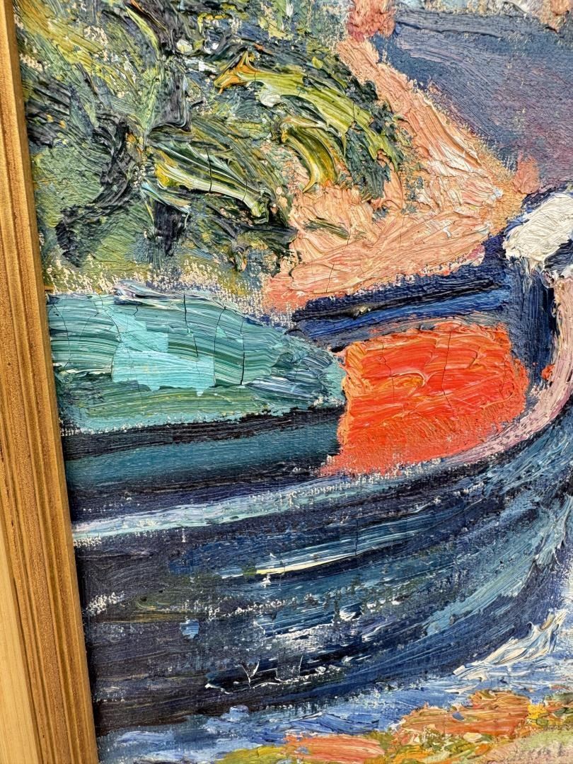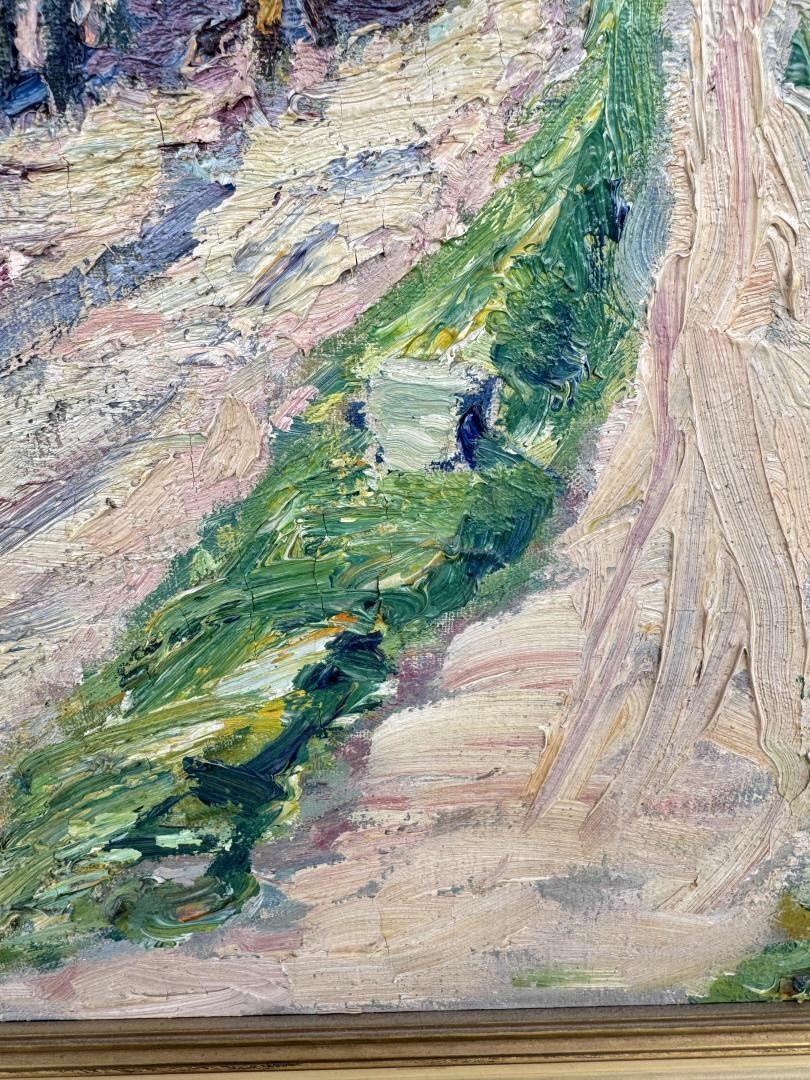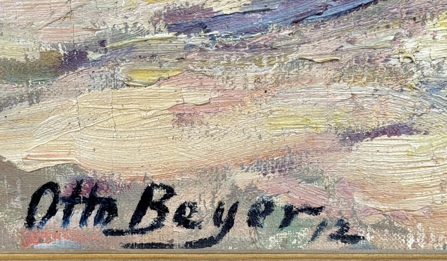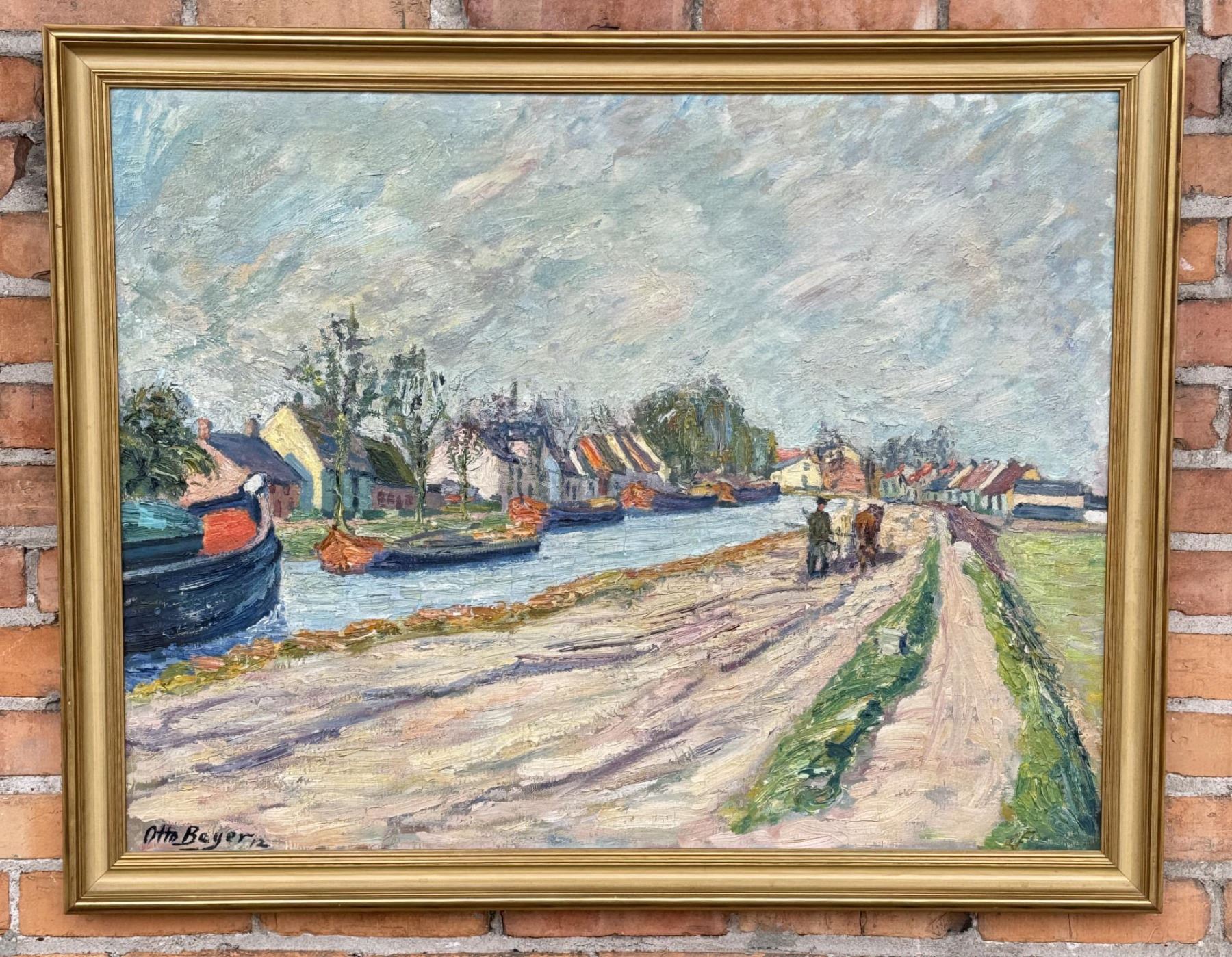 Title is Along the Canal. 26" by 34" unframed, 29" by 38" framed. Otto Beyer (1885 - 1962) was active/lived in Germany, Poland. Otto Beyer is known for Painting, landscape, suburbs, nudes and still lifes. Otto Beyer (1885-1962) Otto Beyer was born in the Upper Silesian town of Kattowitz, in today's Poland, in 1885. After his studies in Breslau and Kaliningrad, he moved to Berlin. In 1910, he participated in the exhibition of the 'Berliner Secession' and later joined the 'Free Secession' under the direction of Max Liebermann (1847-1935). He was close to the artists of 'Die Brücke', painting primarily landscapes, nude figures and flowers, as well as working as a graphic artist. During his residence at the Pomeranian coast, he met Corinth and Pechstein, who remarkably influenced Beyer's work. Beyer undertook study trips to Holland, South France and Italy and, besides Berlin, lived in Munich and Paris.