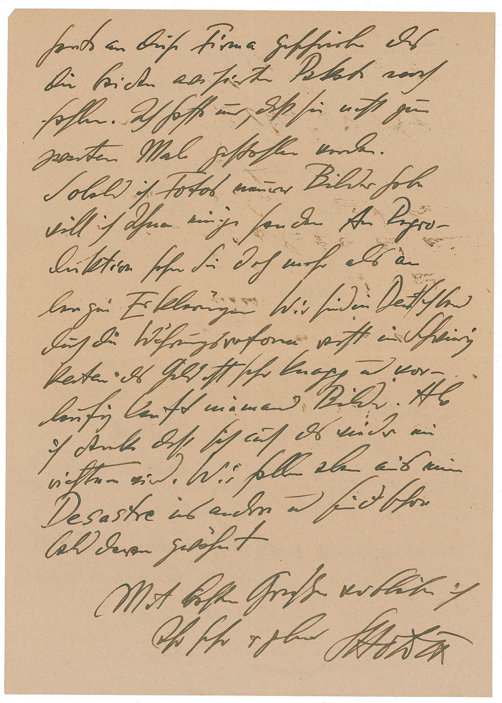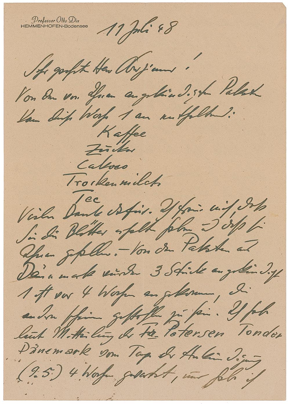 German artist (1891–1969) best known for his Expressionist depictions of Weimar society and the brutality of war. ALS in German, one page both sides, 8.25 x 11.75, personal letterhead, July 11, 1948. Letter to doctor and art collector Justin Upper Room. Dix, acknowledging receipt of food, and reporting on extremely difficult economic situation and the monetary reform. In part: “From the announcement of your packages arrived this week containing 1 on: Coffee, Sugar, Cakao, Dehydrated Tea, I thank you for that. I am glad that you have received the papers and that you like them. - From the packages from Denmark 3 units have been announced [.] 1 has been received before 4 weeks, the others seem to be stolen…Once I have photos of more recent pictures I will send you some. To reproduce it, you see more than long explanations. We are in Germany … the currency reform … is in trouble, the money being very tight and no one buys pictures. But I think that is also set up the back. But we come from a Desastre to another, and will soon be accustomed to.” In fine condition, with bisecting mailing folds, uniform light toning, and light show-through from text on either side. Pre-certified PSA/DNA and RRAuction COA.