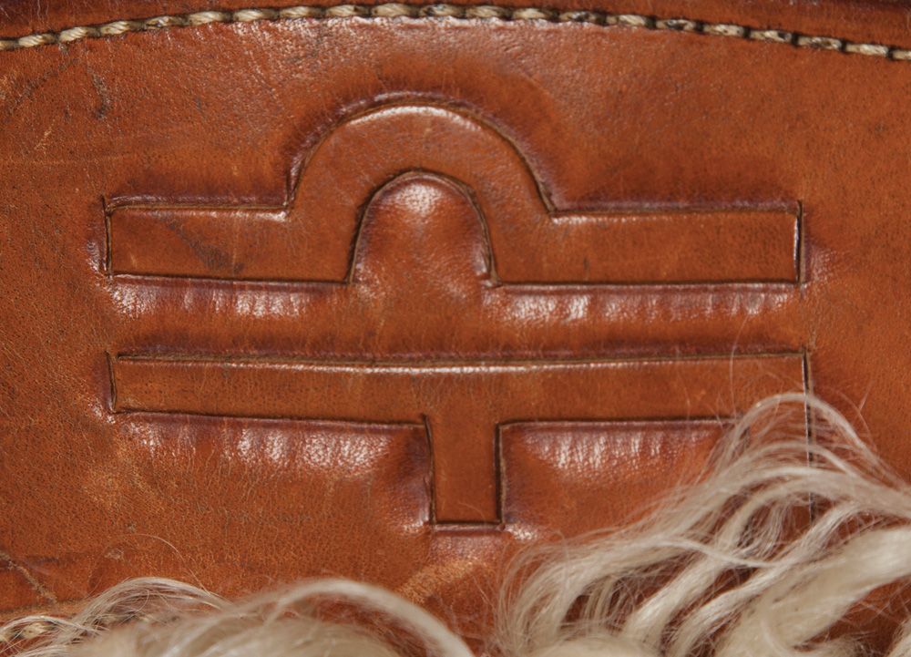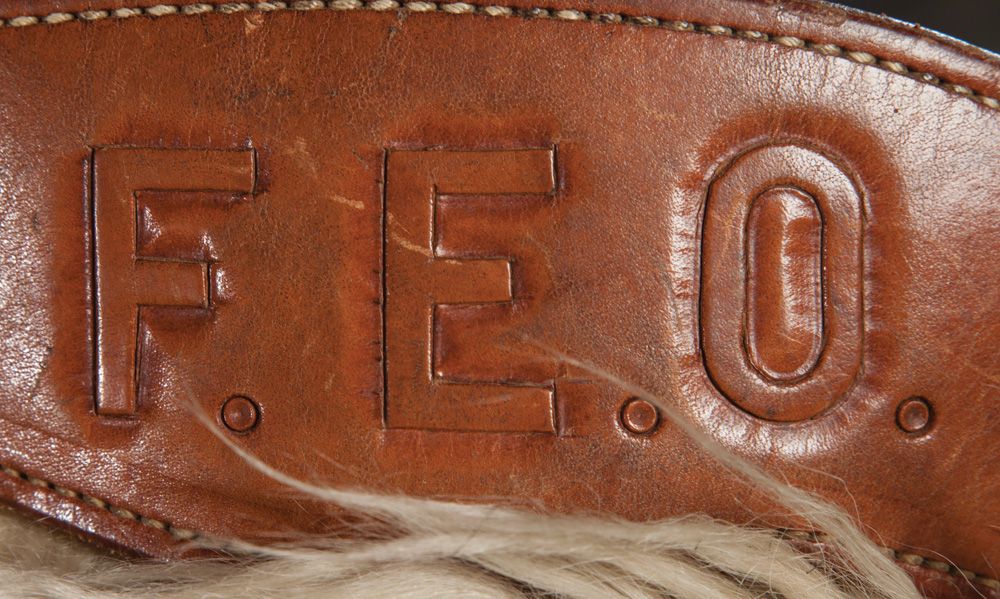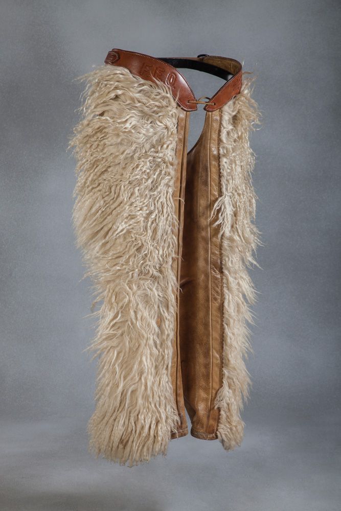 Otto F. Ernst White Woolies. Lush white angora chaps with plain belt custom stamped with "Mill Iron" brand and FEO. Maker-marked with a deep clear Otto F. Ernst - Sheridan Wyo. stamp on the billet. Overall excellent with slight hair loss. Circa early 1900.