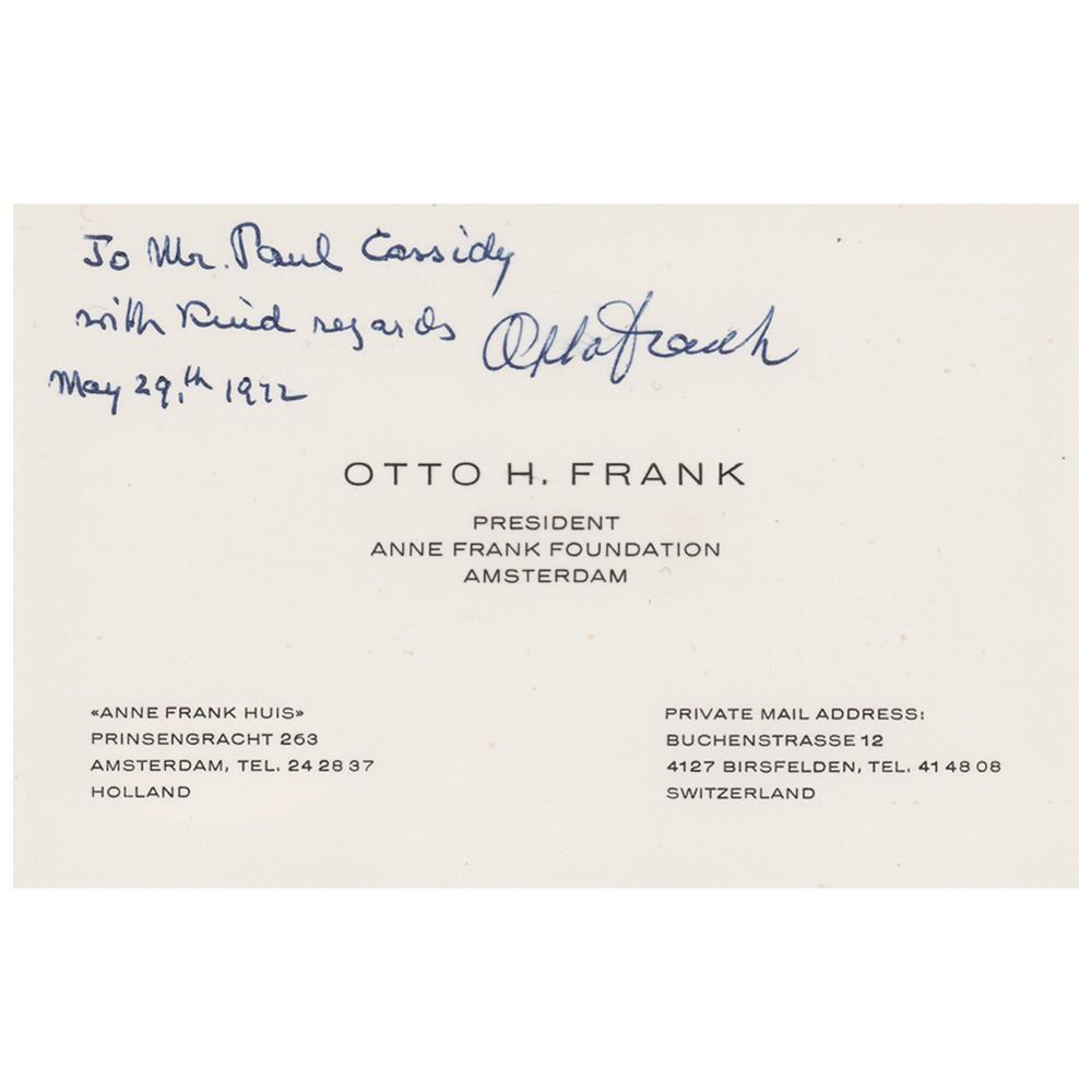 Personal business card belonging to "Otto H. Frank, President, Anne Frank Foundation, Amsterdam," 4 x 2.75, signed and inscribed in ballpoint, "To Mr. Paul Cassidy, with kind regards, Otto Frank, May 29th, 1972." In very fine condition. Accompanied by a certificate of authenticity from JSA.