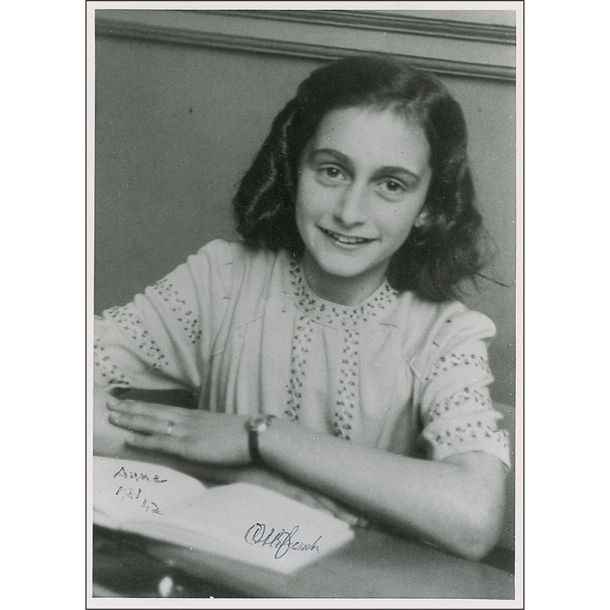 Father (1889–1980) of Jewish World War II diarist Anne Frank, and the only member of his family to survive the concentration camps. Vintage glossy 4 x 5.75 photo of Anne Frank, signed in black ballpoint by her father, “Otto Frank.” adding “Anne, 1941/42.” In fine condition, with a few light surface marks and some irregular ink adhesion to the signature and date.
