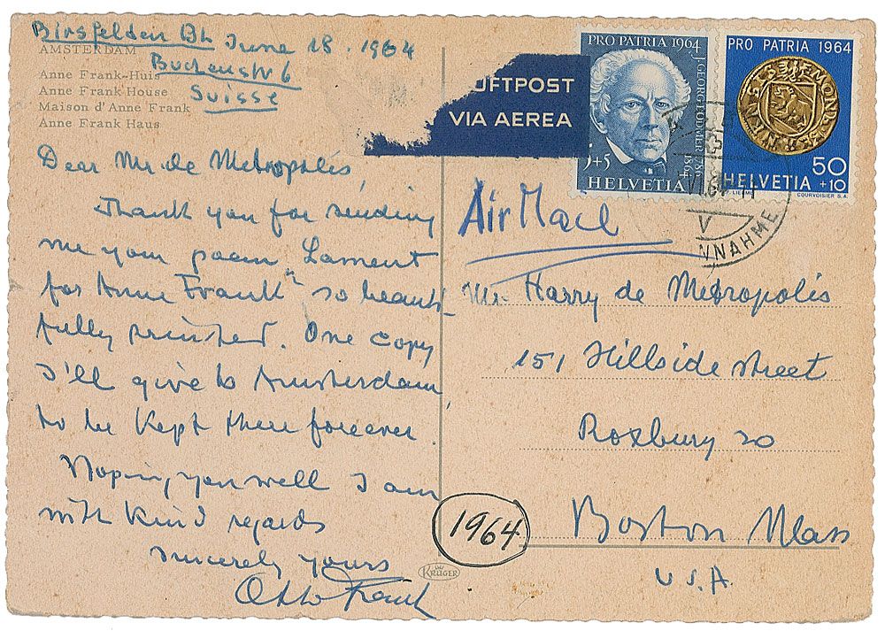 Father (1889–1980) of Jewish World War II diarist Anne Frank, and the only member of his family to survive the concentration camps. ALS, on a 5.5 x 4 deckle-edge photo postcard of the Anne Frank house, June 18, 1964. Letter to Harry de Metropolis. In part: “Thank you for sending me your poem Lament for Anne Frank so beautifully printed. One copy I’ll give to Amsterdam to be kept there forever.” A uniform shade of mild toning, scattered creases, with a moderate central horizontal crease, and an ink notation at bottom, otherwise fine condition.
