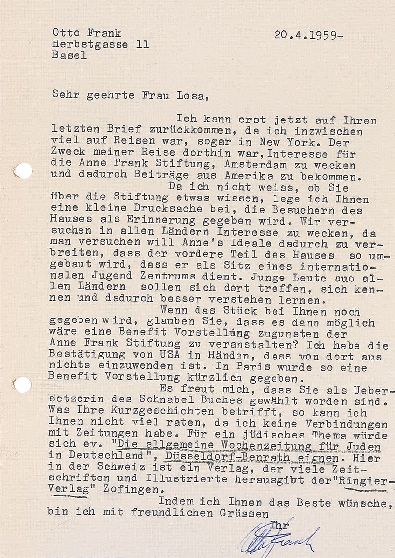 Father (1889–1980) of Jewish World War II diarist Anne Frank, and the only member of his family to survive the concentration camps. TLS in German, one page, 5.75 x 8.25, April 20, 1959. Untranslated letter about the Anne Frank Foundation and the United States’s growing interest in it. In fine condition.