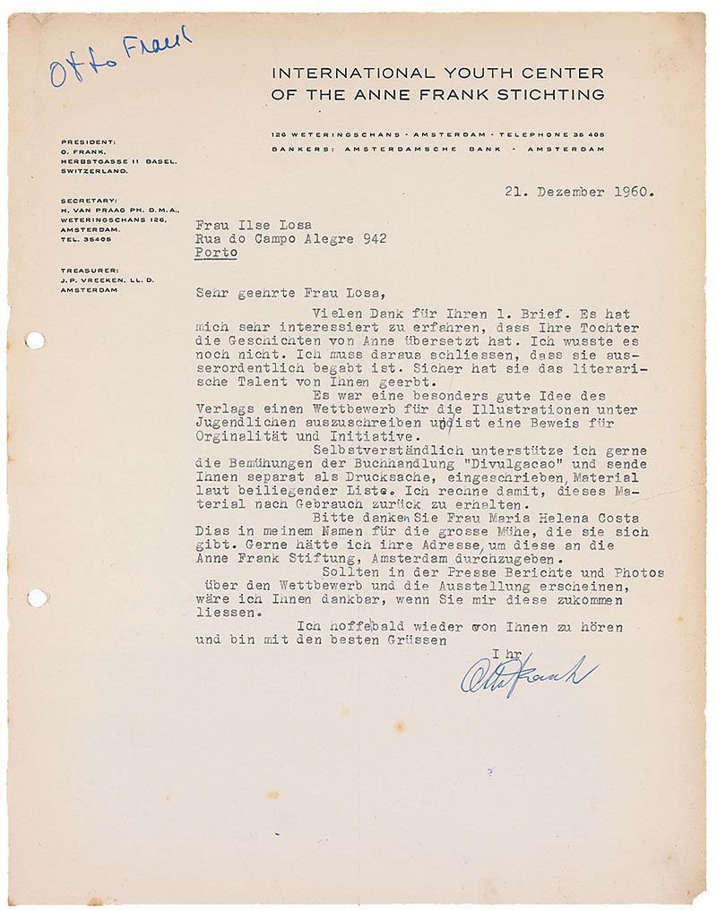 TLS in German, one page, 8.5 x 10.75, International Youth Center of the Anne Frank Stichting letterhead, December 21, 1960. Frank writes that he is very happy to know that the stories of Anne Frank had been translated by the recipient’s daughter. In very good to fine condition, with edge toning, two punch holes to left border, a repaired tear to right edge, and subtle foxing.
