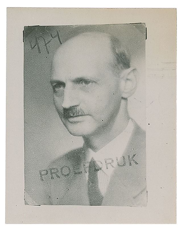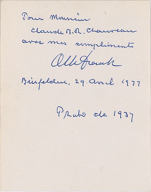 Father (1889–1980) of Jewish World War II diarist Anne Frank, and the only member of his family to survive the concentration camps. Two items: a glossy 3 x 4 proof photo of Frank as he appeared in 1937, signed and inscribed on the reverse in blue ballpoint in French, and dated April 29, 1977; and a TLS in French, one page, 5.75 x 8.25, personal letterhead, April 28, 1977, in part (translated): "As I understand your intention to make a photographic memorial of the Second World War, I am sending you here an old photo of me for your collection." In fine condition.