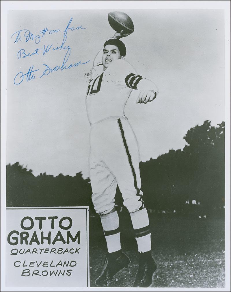 Pro Football Hall of Famer (1921-2003). Glossy 8 x 10 photo of Graham preparing to throw a pass, signed and inscribed in blue ballpoint “To my # one fan, Best wishes, Otto Graham.” In fine condition.