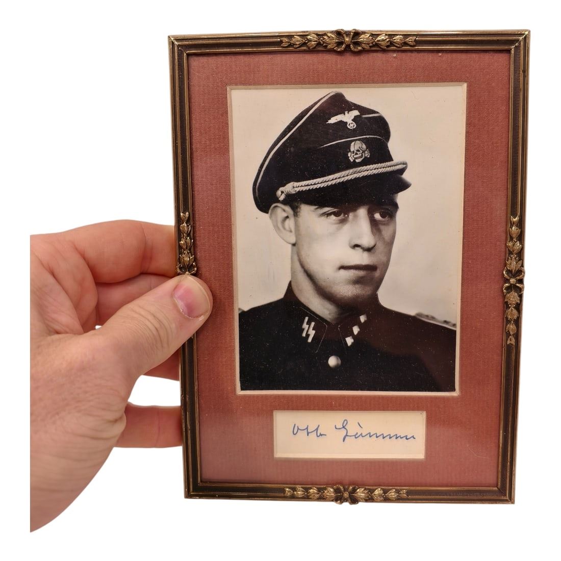 Otto Gunsche Signed Photo in Frame.Otto Günsche (24 September 1917 – 2 October 2003) was a German mid-ranking officer in the Waffen-SS of Nazi Germany during World War II. He was a member of the SS Division Leibstandarte before he became Adolf Hitler's personal adjutant. Günsche was taken prisoner by soldiers of the Red Army in Berlin on 2 May 1945. He was held in various labour camps and prisons by the Soviet Union until 2 May 1956 and provided key testimony regarding Hitler's death.