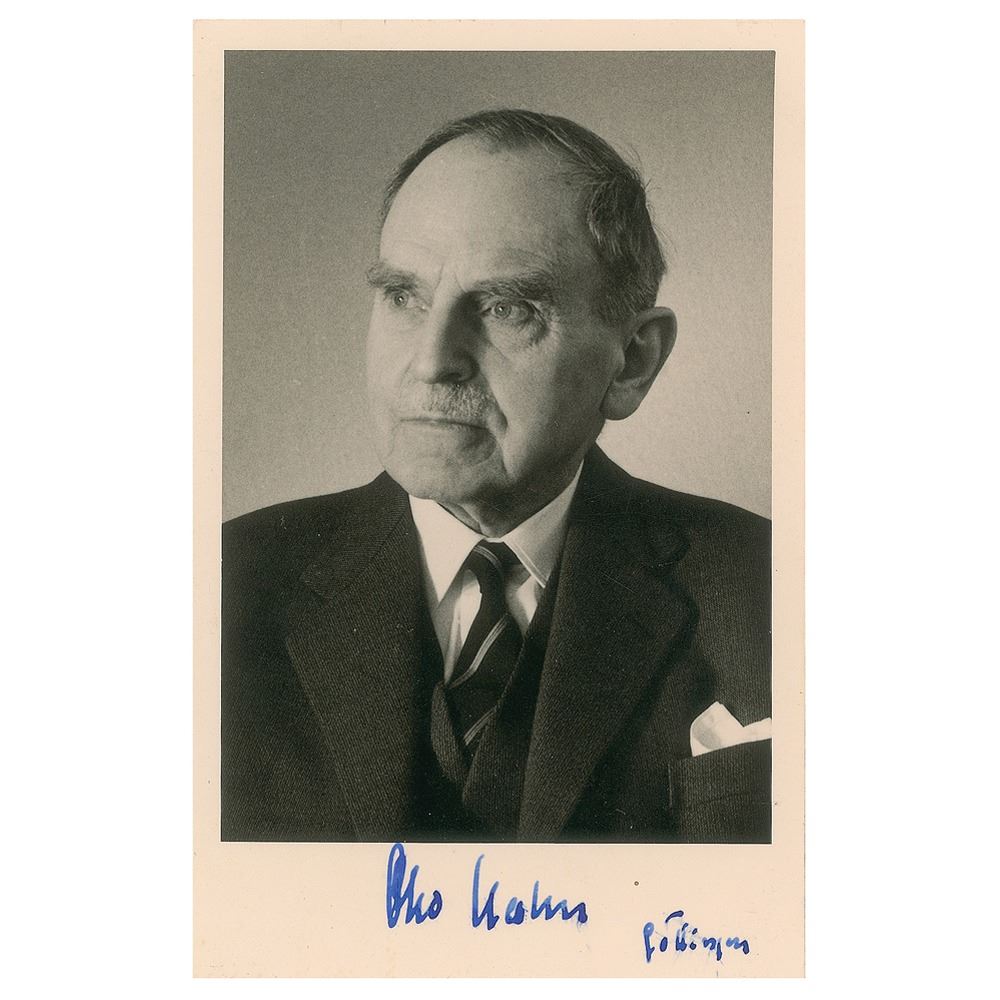 Vintage matte-finish 3.5 x 5.5 photo of Hahn, nicely signed in the lower border in fountain pen, "Otto Hahn, Gottingen." In fine condition.