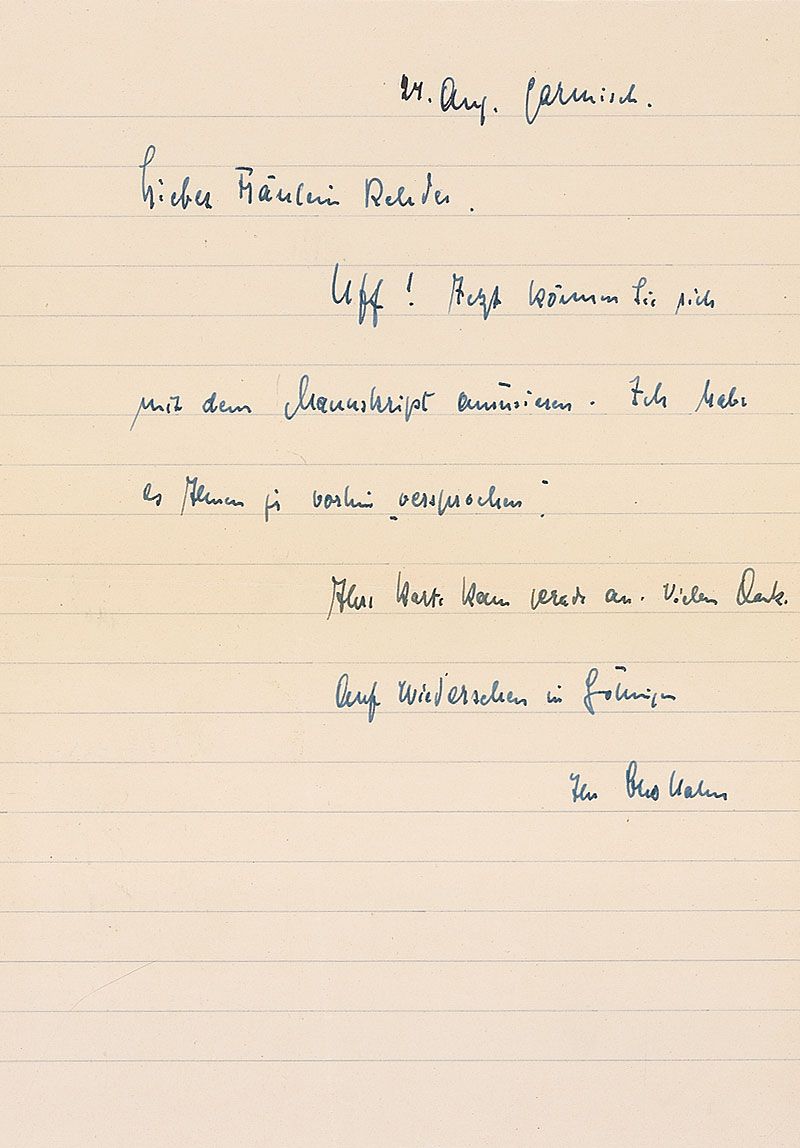 German chemist (1879–1968) who won the 1944 Nobel Prize for the discovery of nuclear fission. ALS in German, one page, lightly-lined, 5.75 x 8.25, September 24. Letter to his secretary, Marie-Luise Rehder, translated in part: “Now you could appreciate this manuscript…Like I promised it to you before.” In fine condition. Originates from Rehder’s estate.