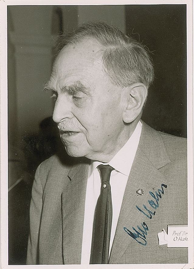 German chemist (1879–1968) who won the 1944 Nobel Prize for the discovery of nuclear fission. Vintage glossy 4 x 5.75 photo of Hahn at a conference, signed in fountain pen. In fine condition.