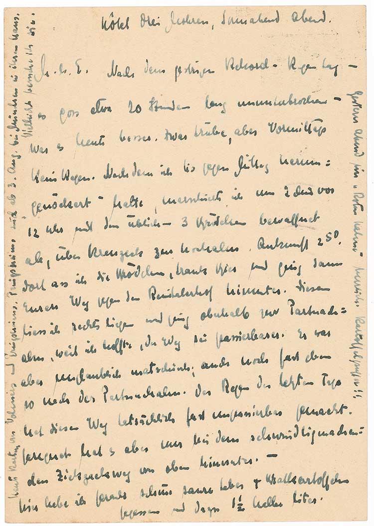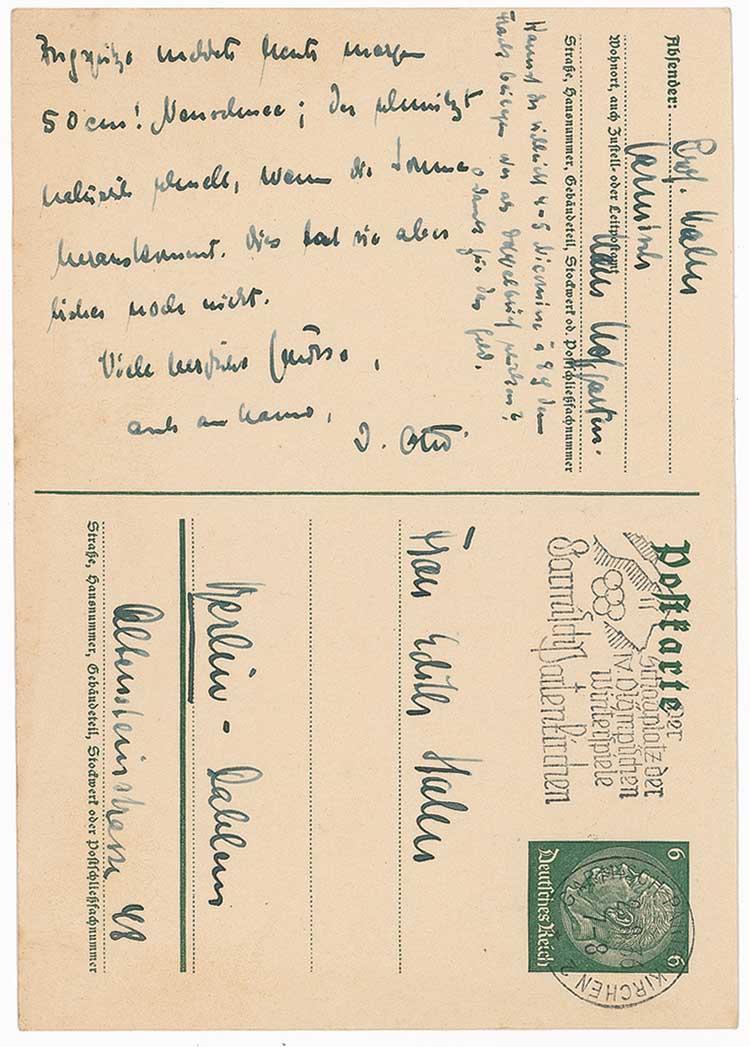 German chemist (1879–1968) who won the 1944 Nobel Prize for the discovery of nuclear fission. ALS in German, signed “D. Otto,” both sides of a 4.25 x 6 postcard, no date, but postmarked August 2, 1936. Letter to his wife Edith. In part: “After yesterday's record-breaking rain - it was pouring continuously for about 20 hours- it better today…and about the food in Garmisch…Here I have eaten just beautiful liver and fried potatoes and sour to 1 liters.” In fine condition. RRAuction COA.