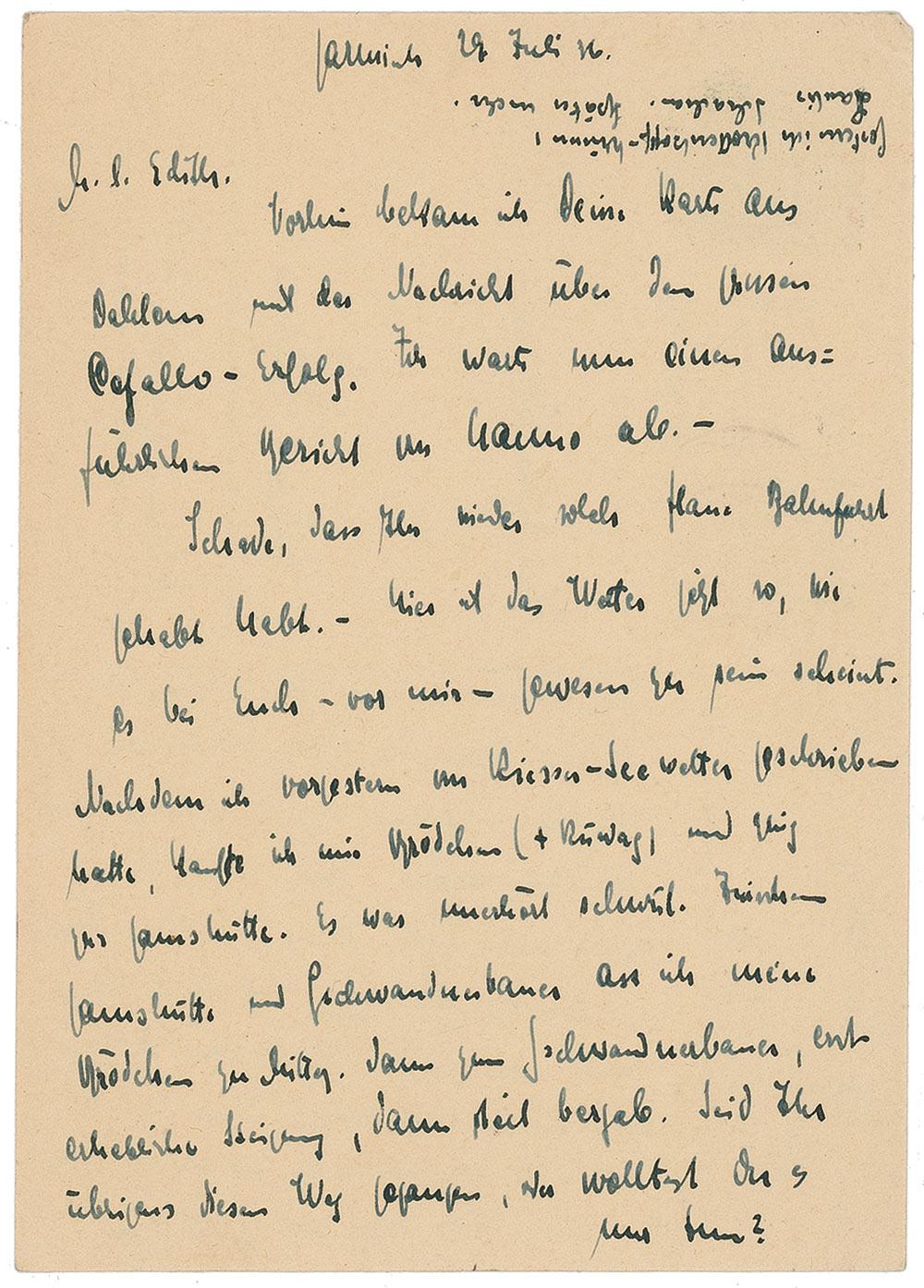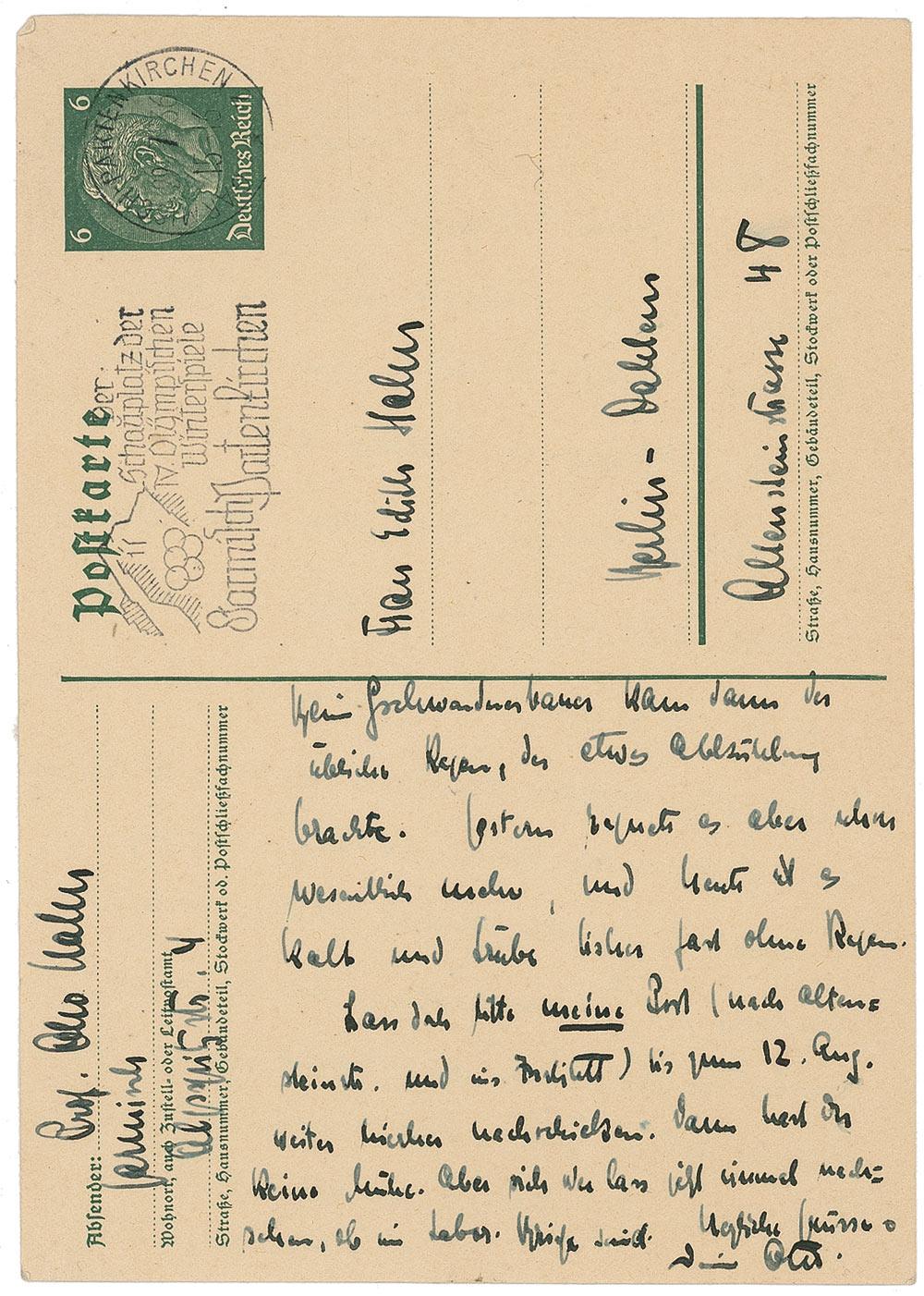 German chemist (1879–1968) who won the 1944 Nobel Prize for the discovery of nuclear fission. ALS in German, signed “Otto,” on both sides of a 4 x 5.75 postcard, July 29, 1936. Letter to his wife Edith mentioning his laboratory in Berlin: “Let me search in the laboratory if there are letters.” In fine condition, with uniform light toning, and signature a bit cramped. RRAuction COA.