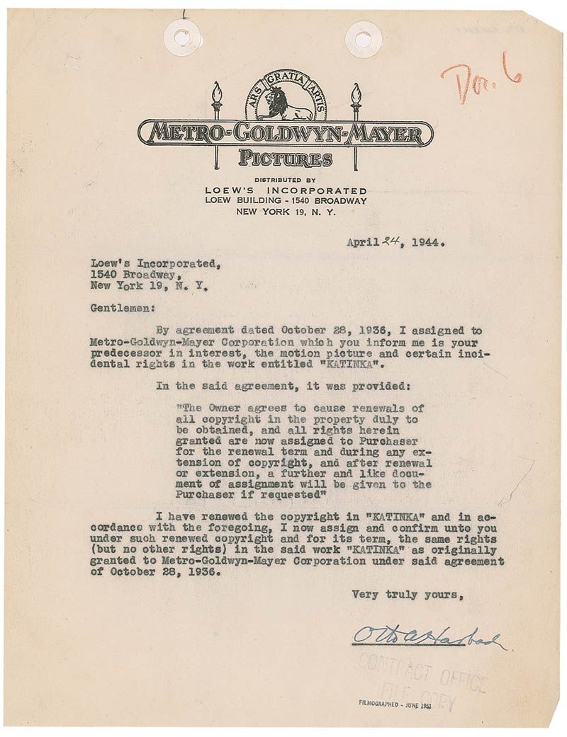 Lyricist and librettist (1873–1963) of fifty musical comedies who served as Oscar Hammerstein II's mentor. DS, signed “Otto A. Harbach,” one page, 8.5 x 11, April 24, 1944. Upon renewing the copyright to Katinka, Harbach confirms MGM’s rights to the work as provided under a previous agreement. In very good condition, with scattered creases, light toning, reinforced filing holes to the top border, a tiny tear to the upper left repaired on the reverse, slight paper loss to the upper right corner, and a couple office stamps and notations.