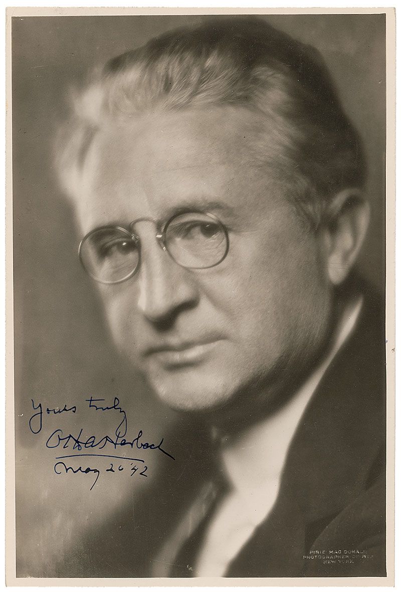 Lyricist and librettist (1873–1963) of fifty musical comedies who served as Oscar Hammerstein II's mentor. Choice vintage glossy 6 x 9 portrait of Harbach, signed in fountain pen, “Yours truly, O. Harbach, May 26, ’42.” In fine condition. Just the second Harbach photo we have offered.