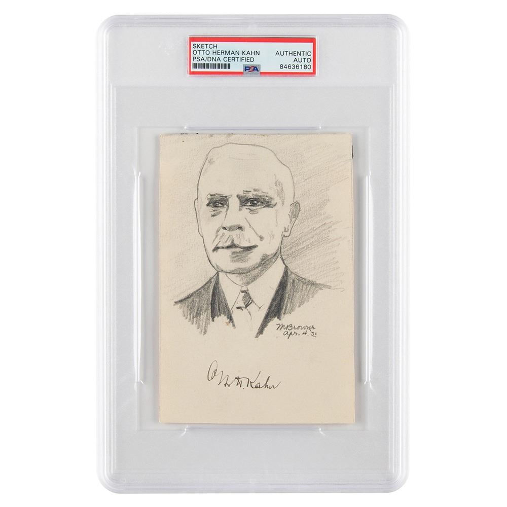 German-born American investment banker, collector, philanthropist, and patron of the arts (1867-1934). Original pencil sketch of Otto Kahn accomplished by an amateur artist on an off-white 4 x 6 sheet, signed below in fountain pen, "Otto H. Kahn." In fine condition. Encapsulated in a PSA/DNA authentication holder.