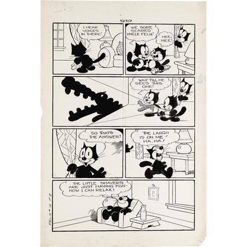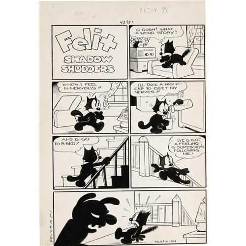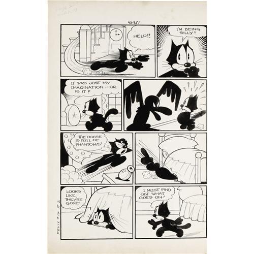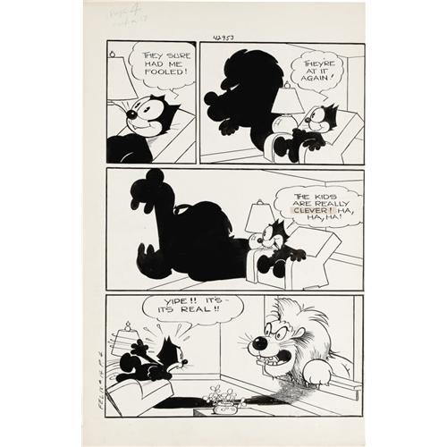 <B>Otto Messmer - Felix the Cat #14, Complete 12-page Story "Shadow Shudders" Original Art (Dell, 1950).</B></I> A jittery Felix gets a royal scare from the king of beasts, in this twelve page tale by Otto Messmer. Each page has an image area of 12" x 18". In Very Good condition.<BR><BR><b>Shipping:</b> Large Flat (<a target="_blank" href="http://www.heritageauctions.com/common/shipping.php">view shipping information</a>)