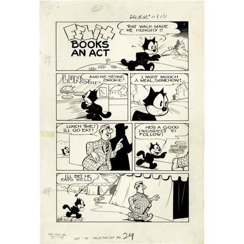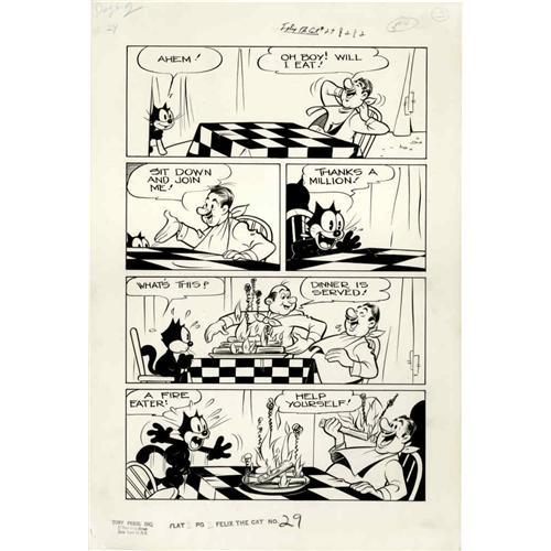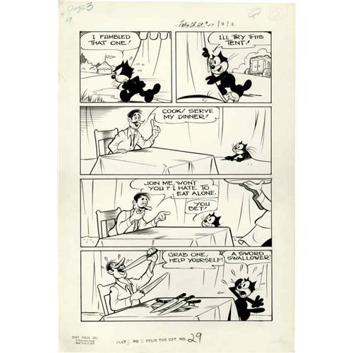 <B>Otto Messmer - Felix the Cat #29 Complete 12-page Story "Felix Books An Act" Original Art (Toby Press, 1952).</B></I> This wild and wooly yarn roams the universe. Felix starts out panhandling his lunch at a circus, then escapes to Mars on a magic carpet, and finally returns to the circus on Earth, after foiling the Martians' plan to invade our planet. Only Felix could take readers on such a flight of "stream of consciousness" fantasy! Superb Otto Messmer art. The image area of each page measures 12" x 18", and the art is in Excellent condition.