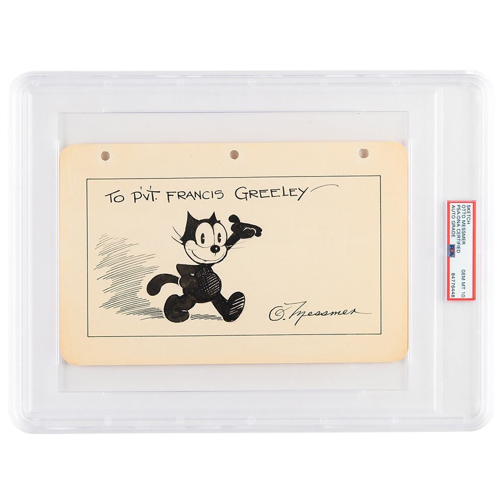Exceptional original vintage sketch of Felix the Cat by Otto Messmer, accomplished in ink and graphite on an off-white 9.5 x 6 album page, which is neatly signed and inscribed in black ink, & ldquo;To P& rsquo;v& rsquo;t. Francis Greeley& mdash;O. Messmer.& rdquo; In fine condition. Encapsulated and graded by PSA/DNA as "GEM MT 10."