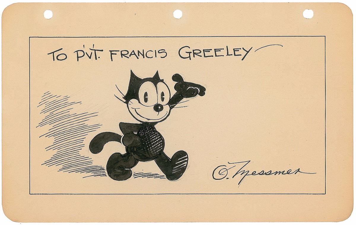 Exceptional original vintage signed ink and graphite sketch of Felix the Cat on an off-white 9.5 x 6 album page, neatly signed and inscribed in black ink, “To P’v’t. Francis Greeley—O. Messmer.” In fine condition.
