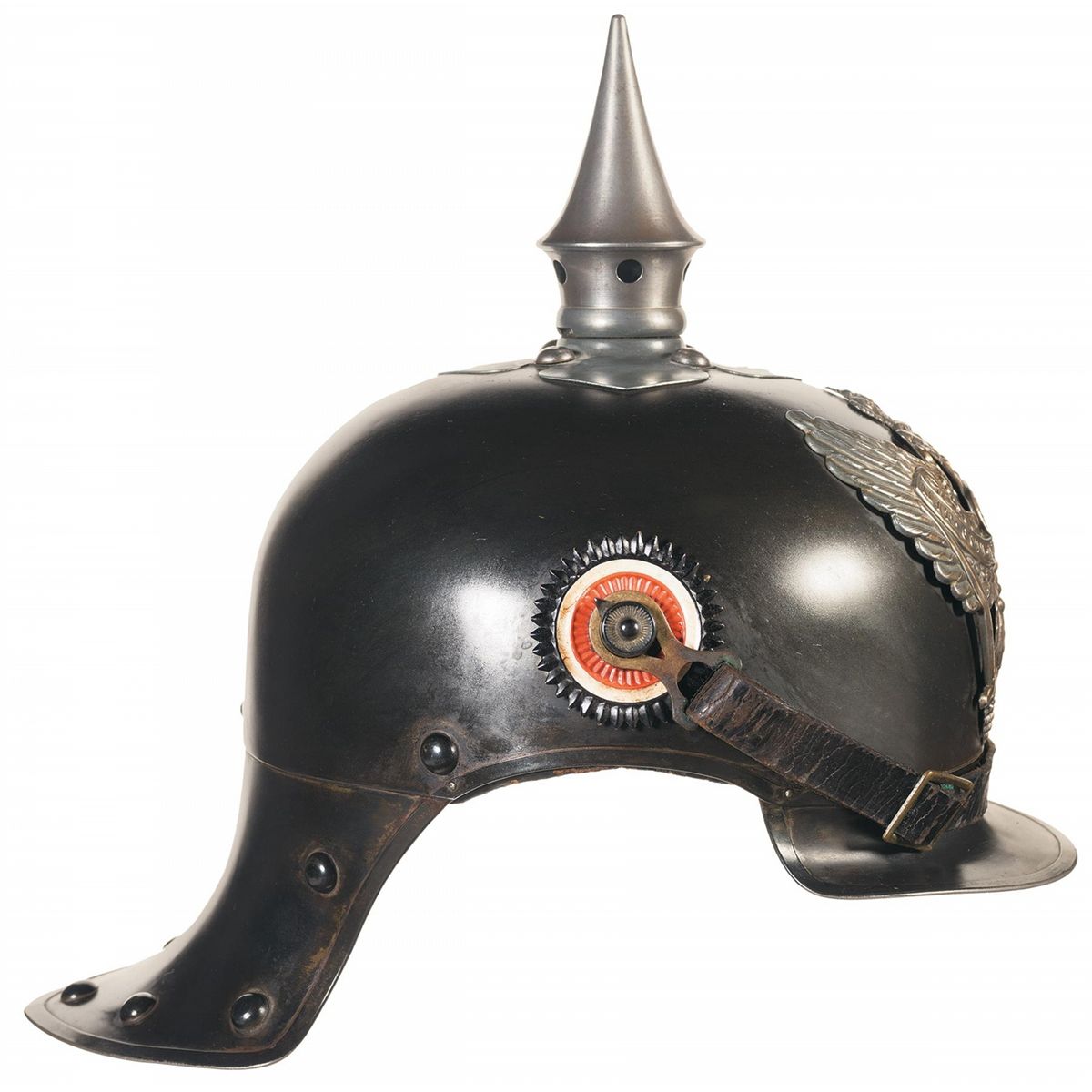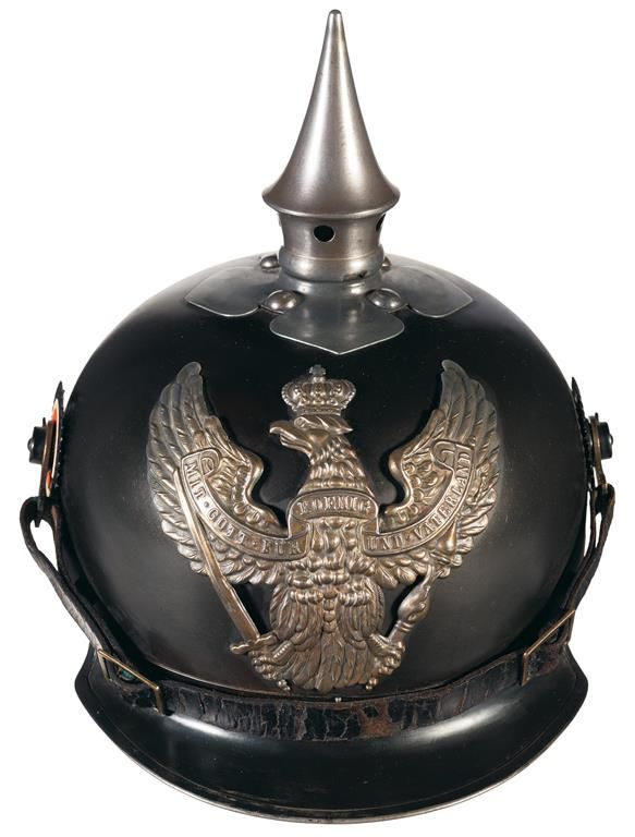Introduced in 1905 to equip Prussia's Mounted Dispatch Rider Regiments. Blackened steel construction overall, with a slight point to the "lobster tail" pattern neck protector, a cloverleaf base for the vent spike, and a silver finished brass eagle emblem on the front. The chinstrap is mounted to the sides, with the proper National black-white-red cockade on the right and the Prussian black-white-black on the left. The underside of the front visor has a green paint finish, with "58" stamped on the underside of the neck protector an adjustable brown leather webbing and "OTTO NACHTIGALL/BERLIN 1915" around the vent hole.