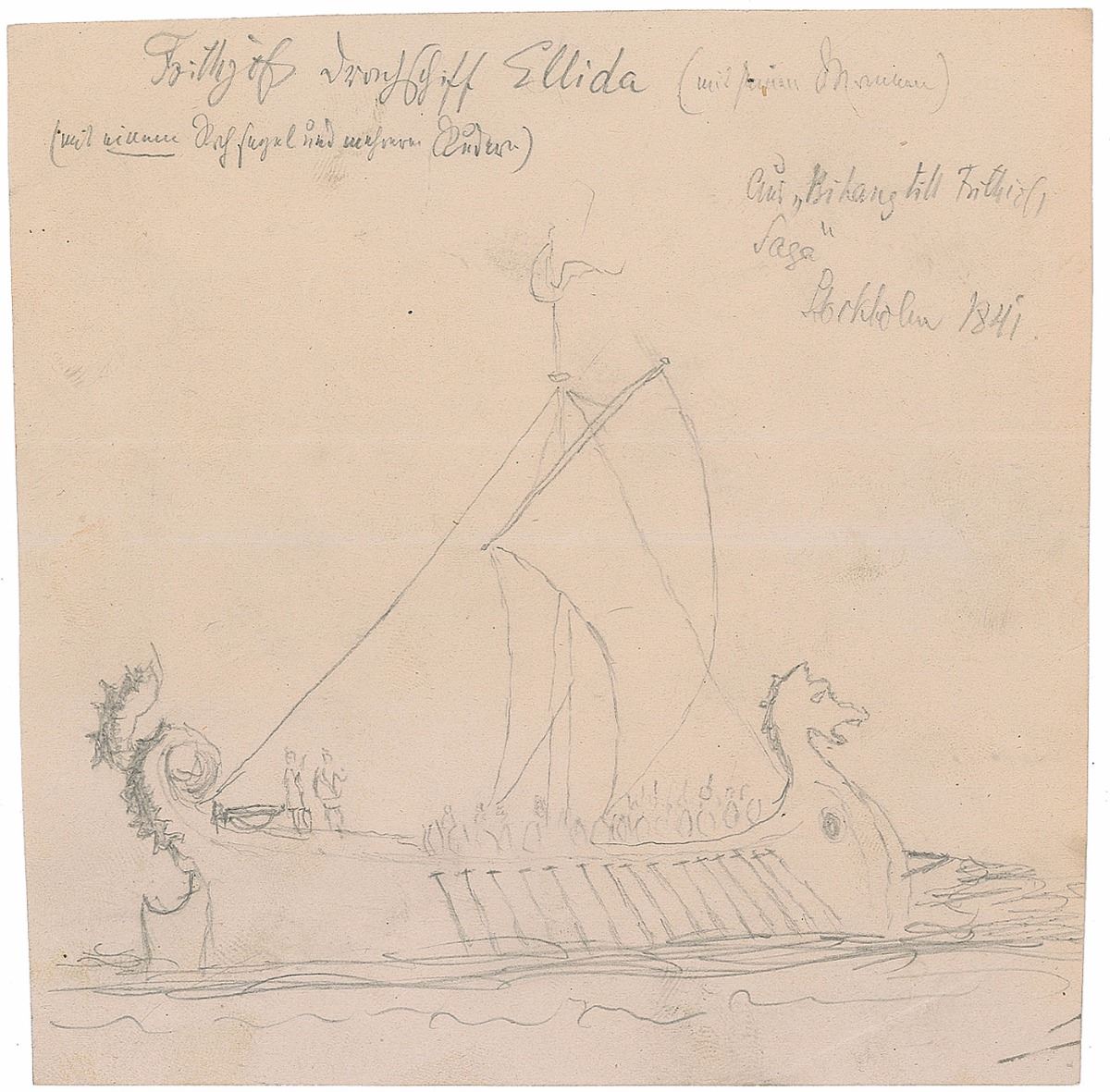 Finnish and Swedish geologist, geographer, and polar explorer (1869–1928). Unsigned pencil sketch by Nordenskjold from Norse mythology of a classic Viking dragon ship at sea on an off-white 5.5 x 5.5 sheet, labeled at the top in German (translated), “Fridtjof’s Dragon ship Ellida (with his men), (with a square sail and several rowing), From 'Bihang till Frithjofs Saga,' Stockholm 1841.” Two horizontal folds, trimmed edges, and light creases, otherwise fine condition.