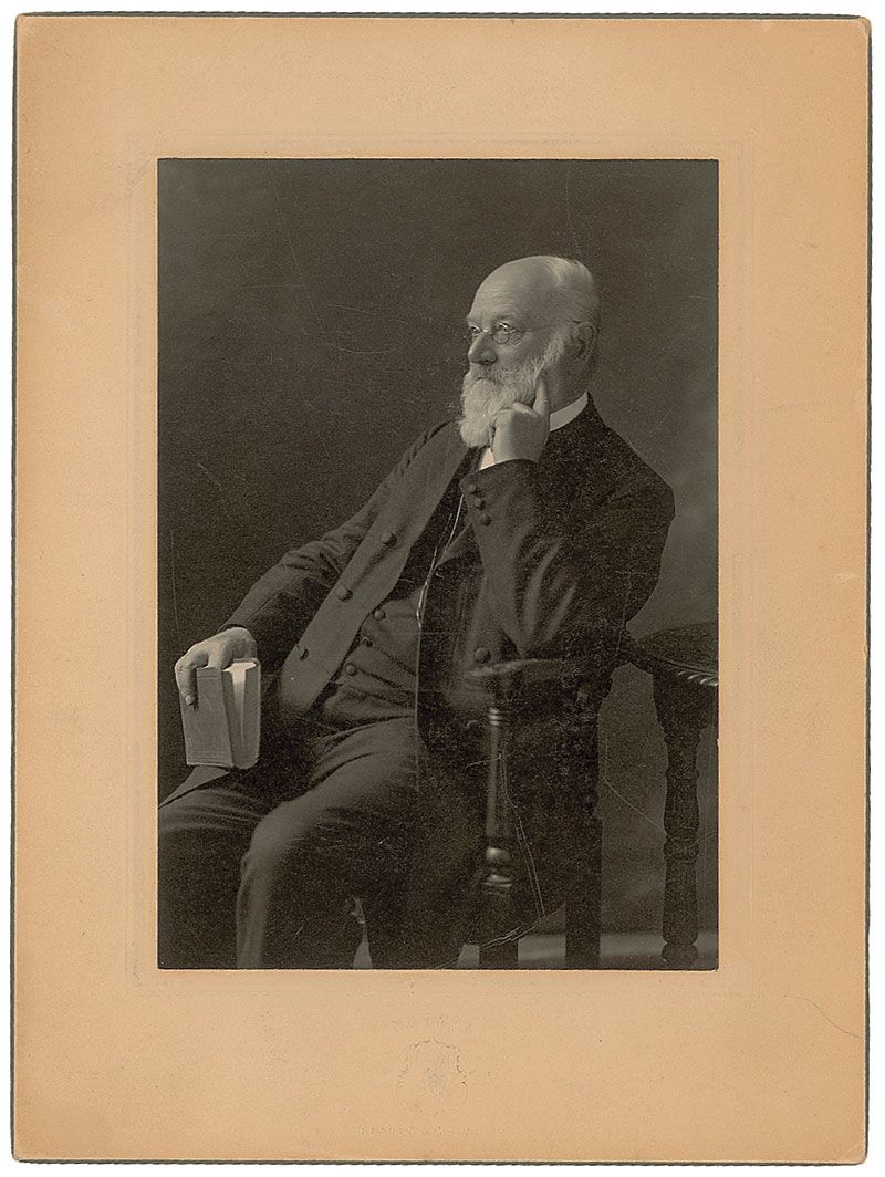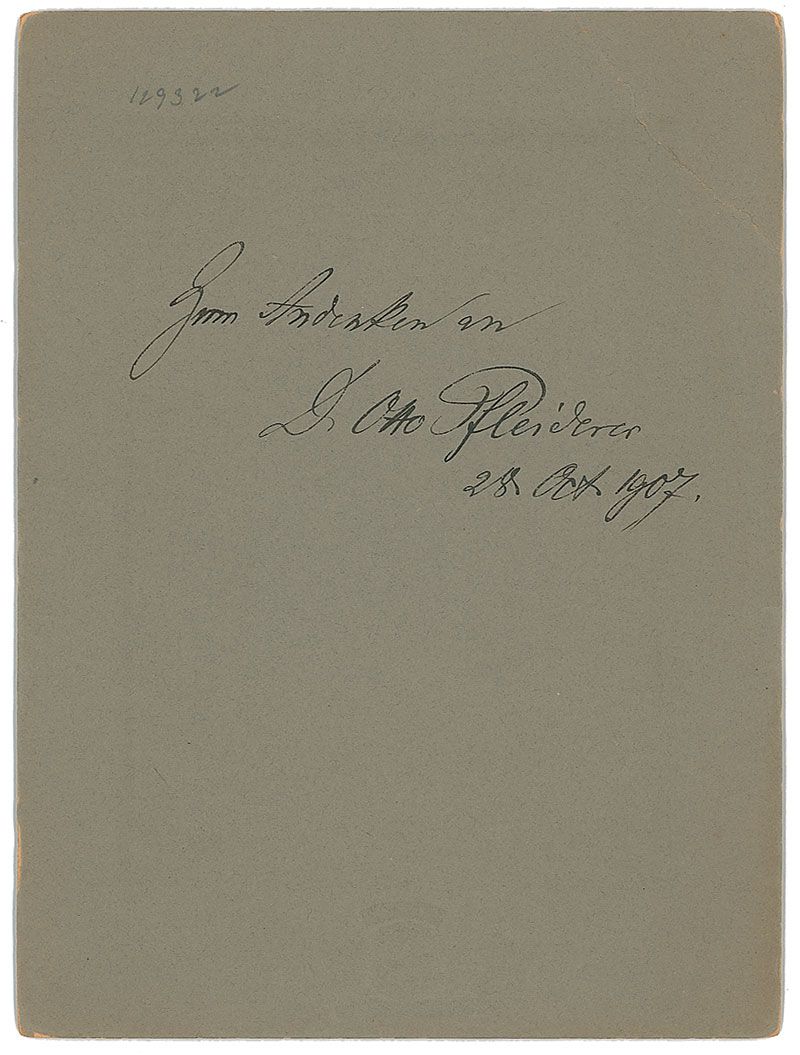 German Protestant theologian (1839–1908) who became known as one of the most influential representatives of liberal theology. Vintage matte-finish 3.75 x 5.5 portrait of Pfleiderer engaged in deep thought affixed to its original 6 x 8 Notman photographer’s mount, signed on the reverse of the mount in black ink, and dated October 28, 1907. In fine condition, with a noticeable diagonal crease to the upper left of the mount.