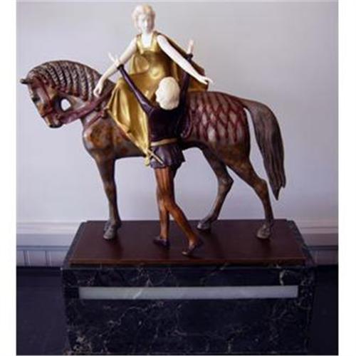 Date of Creation: 1900-1949. Bronze Sculpture by artist Professor Otto Poertzel, 1876-1963, produced in the medium of chryselephantine. The sculpture is one of Tom der Reimer (Thomas the Rhymer). It measures 22" Tall, The Base is 16" x 8". The horse is 17" wide and 12" Tall. The Man is 10.25" Tall. It weighs approximately 30 lbs. This is a beautiful, romantic work of art, in the medium of bronze. The girls head, shoulders, arms and hands, and the head and hands of the youth, are extremely detailed. The faces are exquisitely carved and also with the greatest of detail. The lady is seated sidesaddle on a horse, and is looking down at a love-sick swain who has thrown his lyre on the ground. Her face, arms and hands (and his face and hands) are exquisitely carved white and perfectly blended in the bronze metal of which the statuette is made. The base is made of marble and adds to the weight of the statuette.