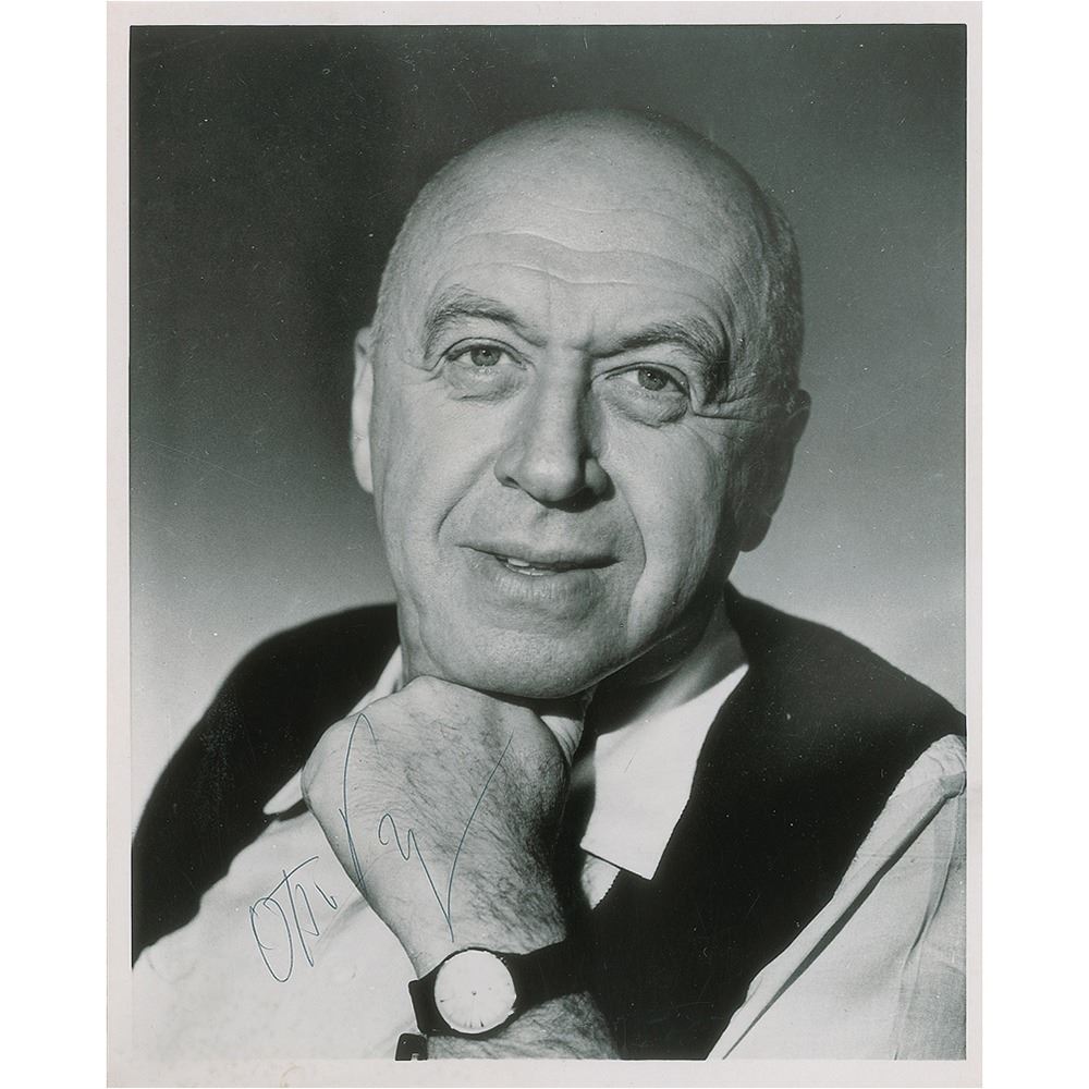 Glossy 8 x 10 photo of the Oscar-nominated director in a pleasant up-close pose, signed in black ballpoint by Otto Preminger. In fine condition, with light overall crazing to the emulsion.