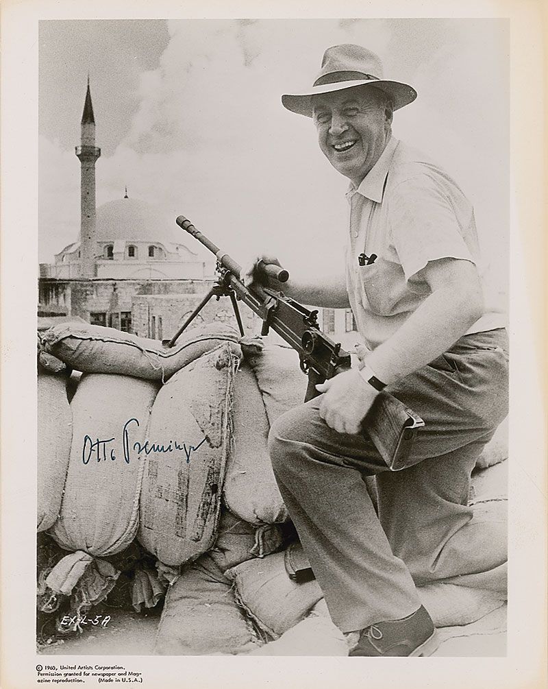 Glossy 8 x 10 photo of Preminger posing behind a gun during the filming of Exodus, signed in black felt tip. In fine condition.