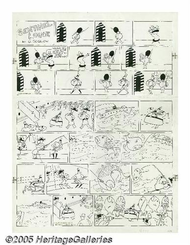 <B>Otto Soglow - The Ambassador Sunday Comic Strip Original Art, dated 11-2-33 (King Features Syndicate, 1933).</B></I> Otto Soglow's <I>The Little King</B></I> didn't originate in Europe, but in the pages of the <B>New Yorker</B></I> magazine in the early 1930s. It was one of the few comics to get its start on the magazine page and grow into a syndicated newspaper feature. <I>The Little King</B></I> was a very popular feature world wide, because of its mostly pantomime format and Soglow's artistry. William Randolph Hearst convinced Soglow to pen a feature for his syndicate, titled <I>The Ambassador</B></I>, until his contract with the <B>New Yorker</B></I> expired. When <I>The Little King</B></I> began on September 9, 1934, <I>The Ambassador</B></I> disappeared! The image area of this piece measures approximately 18" x 23" and, aside from a fold between the <I>Sentinel Louie</B></I> topper and <I>The Ambassador</B></I>, the art is in Excellent condition.