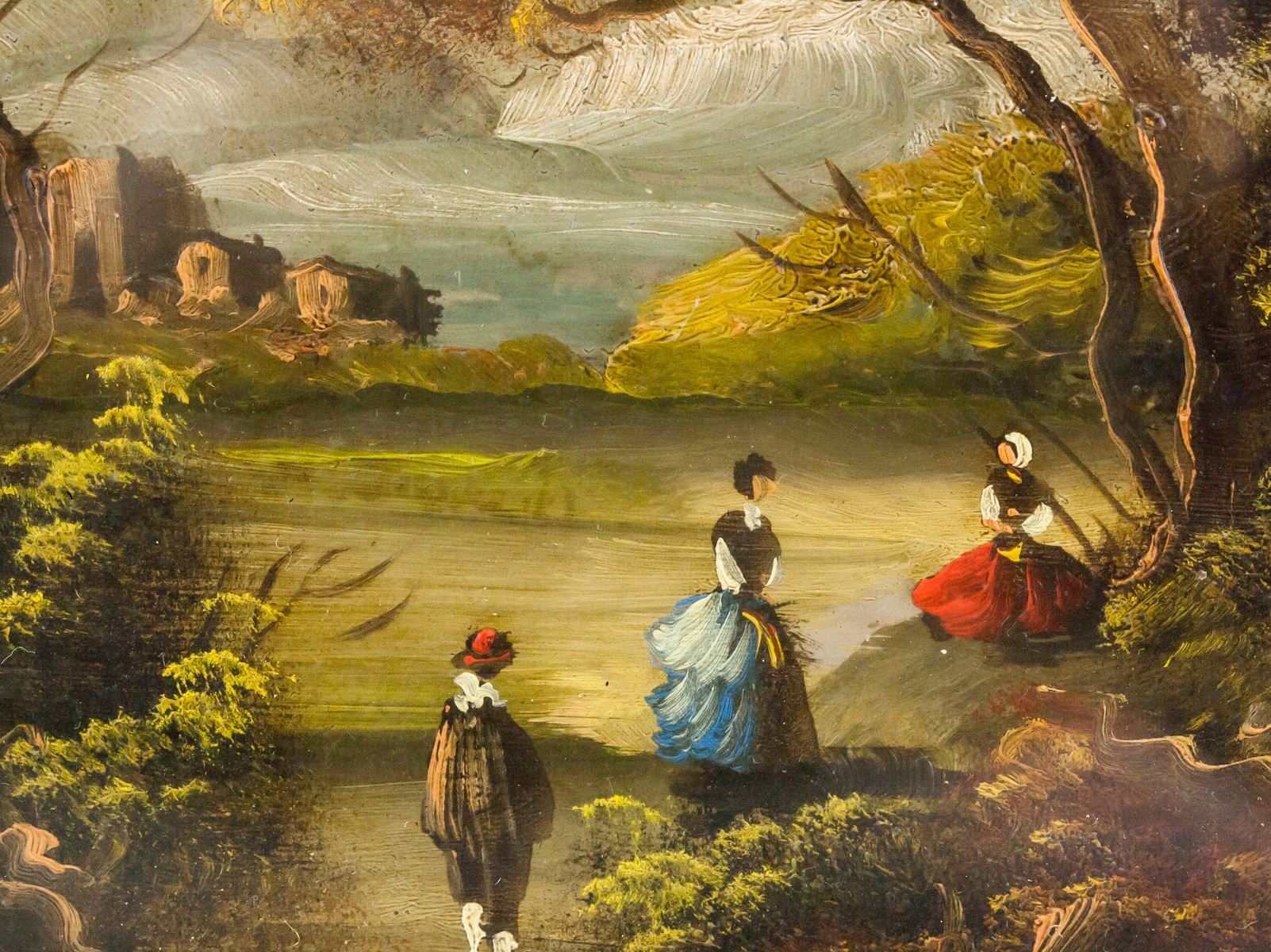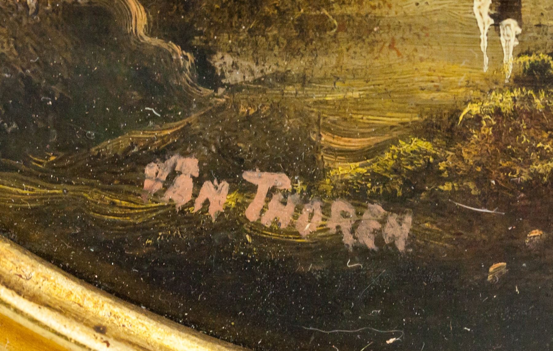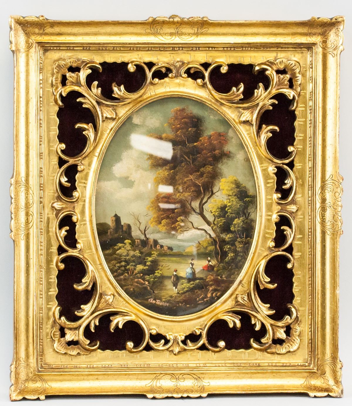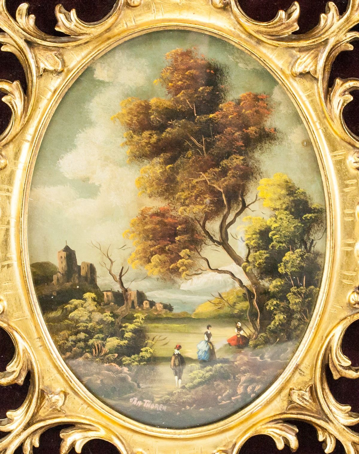 Oil on panel, framed. Featuring oval landscape painting with three figures by a large tree. Signed "Thoren" to the bottom. Otto Thoren (1828-1889, Austrian). Frame: 40 x 35 cm (15.75 x 13.75 in).