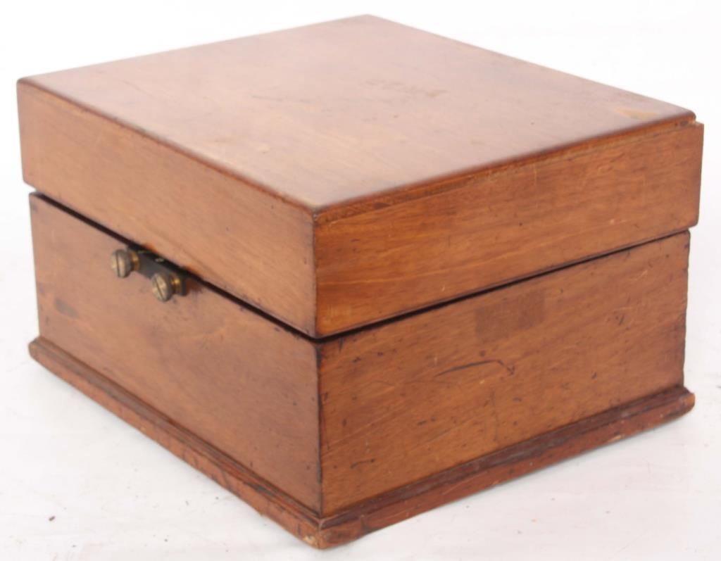 Otto Wolf Double Bridge Electrical Circuit Box. Designed by Otto Wolf, Berlin with serial number 5591, imported by James G. Biddle for the Philadelphia Electric Co. Mechanism is contained in a mahogany box with lid, has a painted steel base plate with brass contacts and 4 calibration knobs on the top. Also has a small portfolio with copies of patent letters and blueprints. 8.5 in. high x 14 in. wide x 12 in. deep.