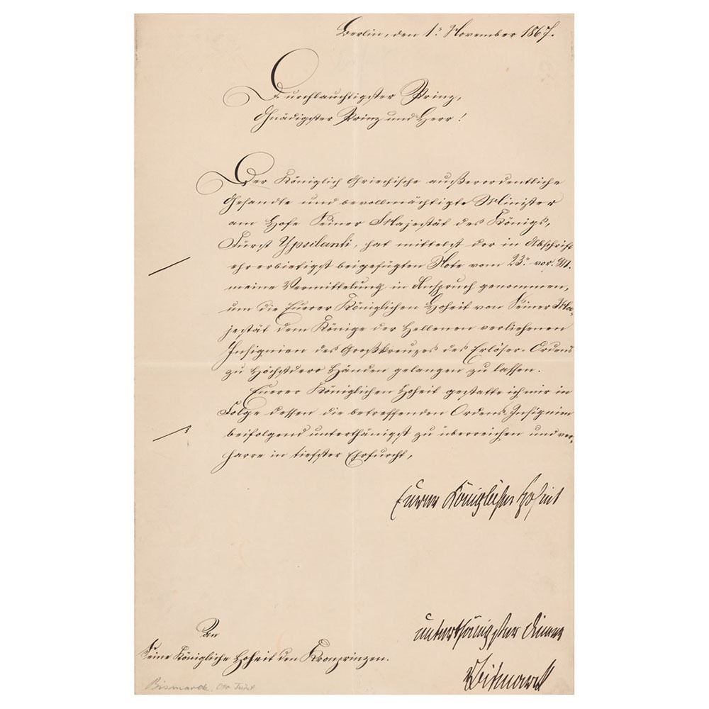 LS in German, signed “Bismarck,†one page, 8.5 x 13.25, November 1, 1867. Untranslated letter signed by Bismarck, with a two-line autograph closing. In fine condition.