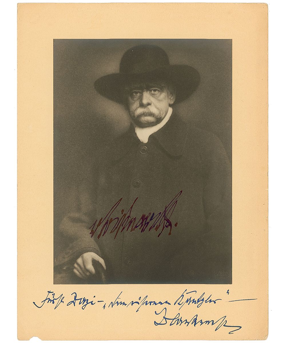 Prussian statesman and First Chancellor of the German Empire (1815–1898). Serious vintage matte-finish 6.5 x 9 half-length portrait of von Bismarck in a hat and coat affixed to a 9.25 x 12.5 mount, signed across the image in ink. Mount bears an ink notation in German across the bottom. Some creasing and a small chip to lower edge of mount, and light contrast to signature against the dark background, otherwise fine condition.