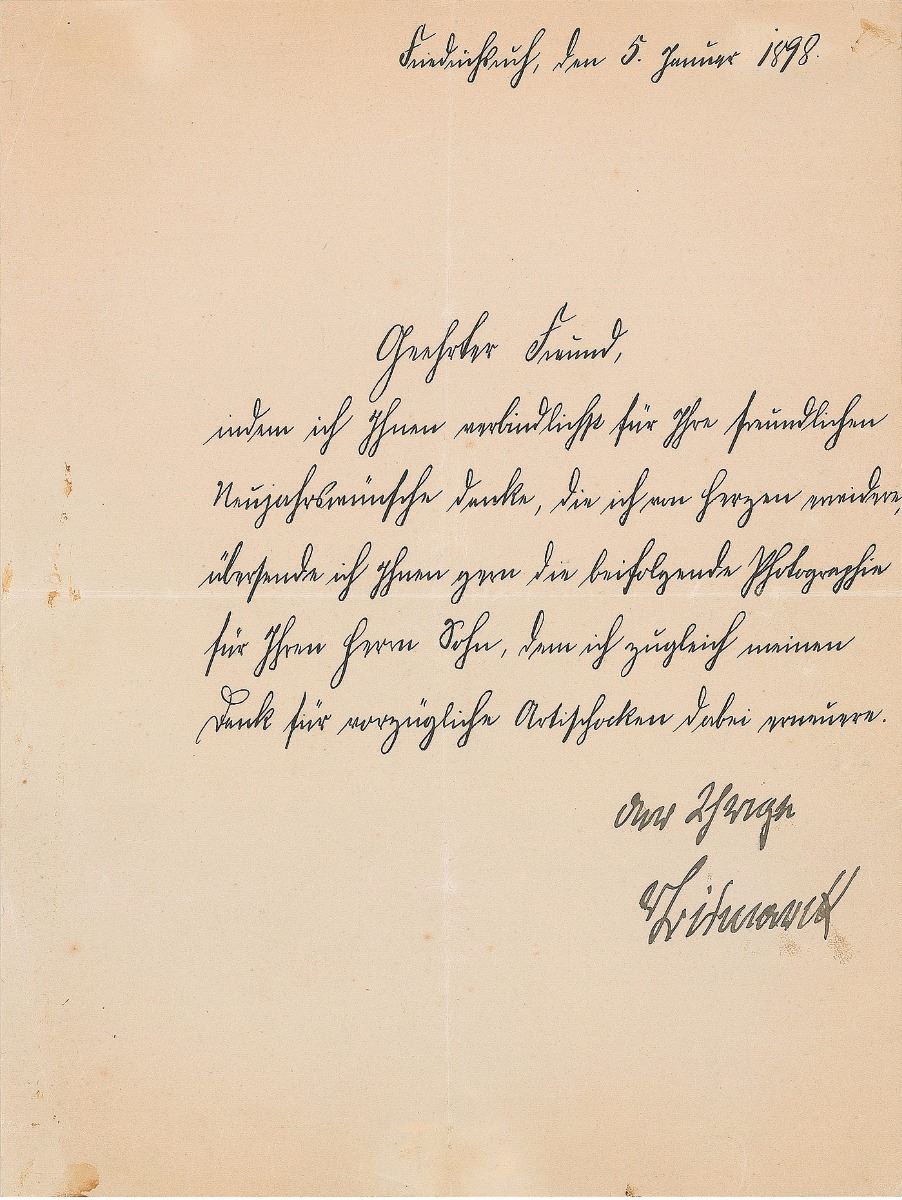 Untranslated LS in German, signed “v. Bismarck,” one page, 8 x 10.25, January 5, 1898. In very good to fine condition, with intersecting folds and a few light stains.