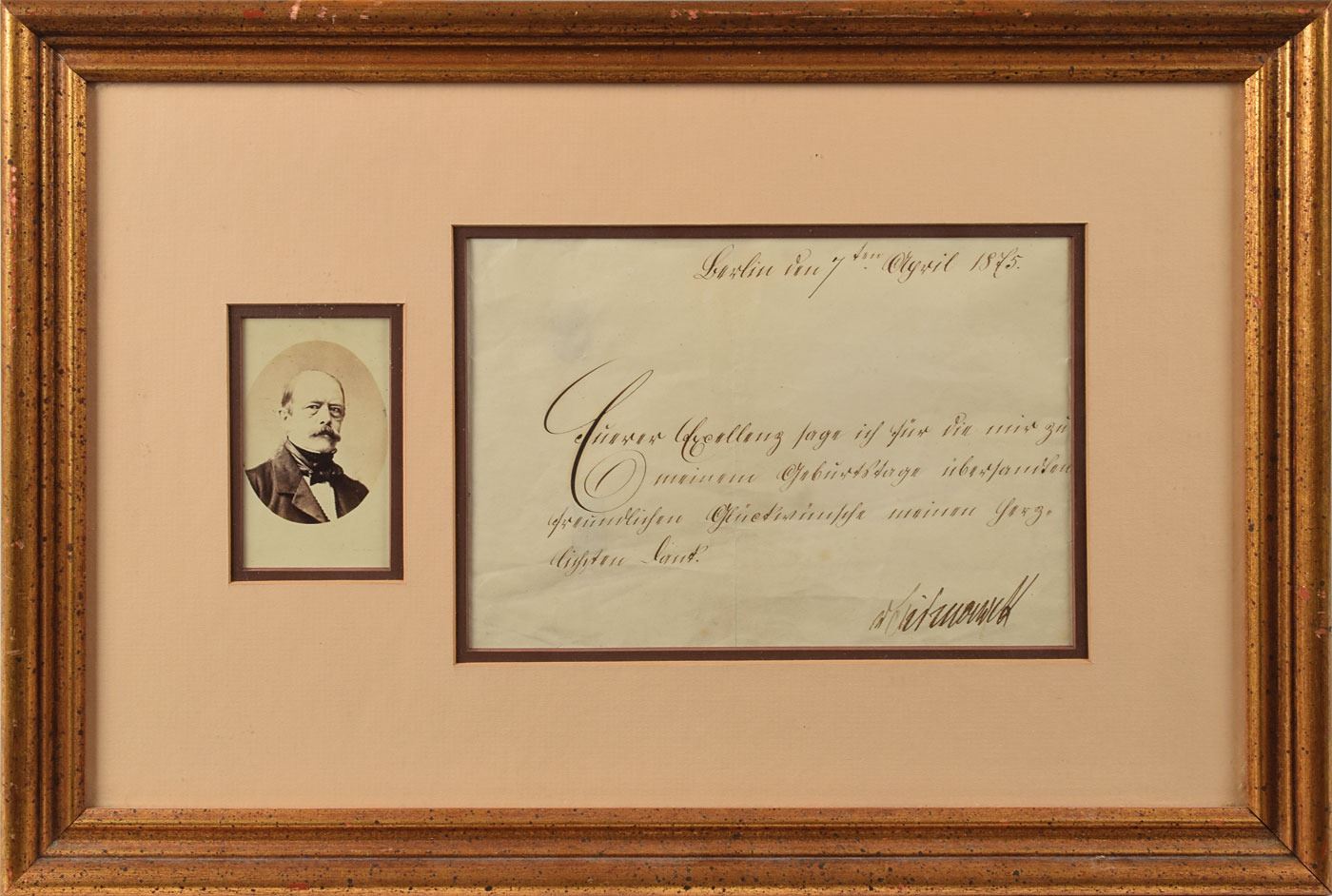 LS in German, signed “v. Bismarck,” one page, 8 x 5.25, April 7, 1875. In full (translated): "Heartfelt thanks for the good wishes Your Excellency sent to me on the occasion of my birthday." Double-matted and framed with a portrait to an overall size of 17 x 11.5. In very good to fine condition, with light overall creasing.