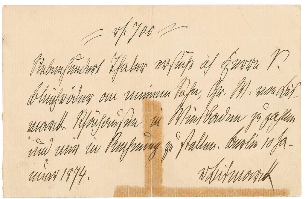 Influential German statesman (1815–1898), known as the “Iron Chancellor,” who served as the first Chancellor of the German Empire from 1871–1890. ALS in German, signed “v Bismarck,” one page, 8.5 x 5.5, January 10, 1874. Letter to bank owner Bleichröder to pay for his son Count Wilhelm von Bismarck-Schönhausen in Wiesbaden the amount of 700 Taler and to charge to his account. In very good condition, with partial separation along bisecting vertical fold, as well as toning along bottom portion of fold and bottom edge.