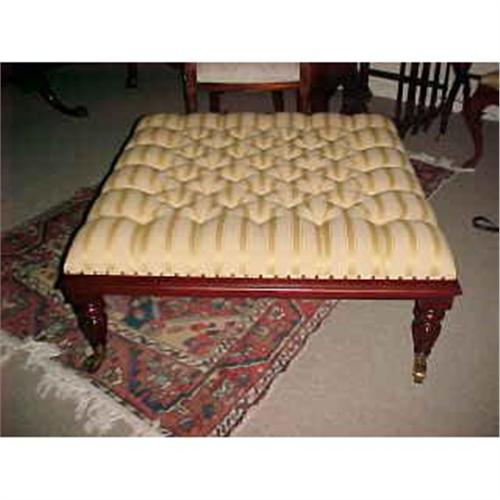 This is a superb square tuffted ottoman with mahogany legs, brass casters and a soft neutral yellow upholstry fabric. This wonderful piece is not only useful but it adds a great element of style to any setting!