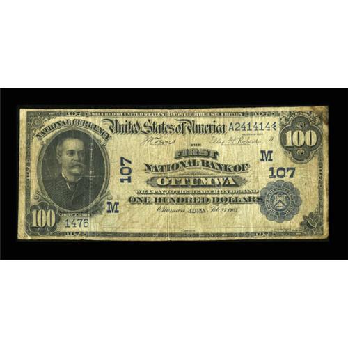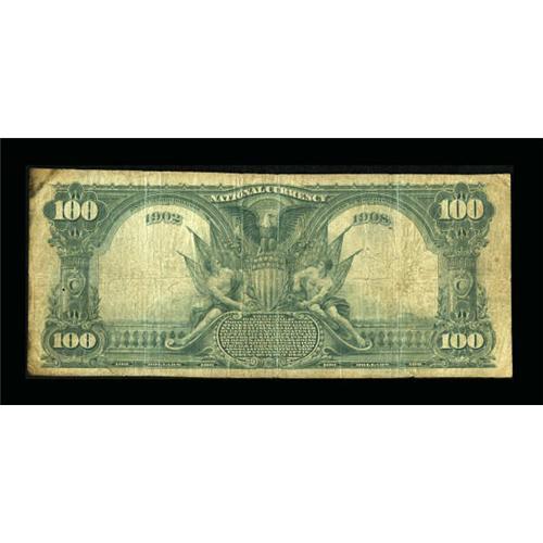 <B>Ottumwa, IA</B></I> - $100 1902 Date Back Fr. 689 <B>The First NB</B></I> Ch. # (M)107<BR> Though a few high denominations are known from this bank, none of the $100's avoided circulation and most saw extensive use. This piece is evenly circulated with some discoloration. The overprint is still bold. <B>Very Good.</B></I><BR><BR><b>Shipping:</b> Coins & Currency (<a target="_blank" href="http://www.heritageauctions.com/common/shipping.php">view shipping information</a>)