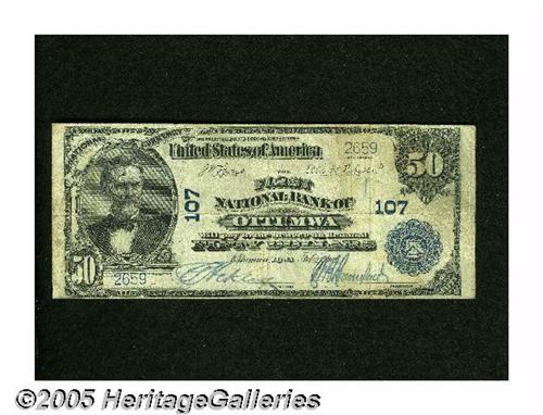 <B>Ottumwa, IA</B></I> - $50 1902 Date Back Fr. 667 <B>The First NB</B></I> Ch. # 107<BR>This <B>Fine-Very Fine</B></I> example hails from a bank we last handled one of this denomination and type from in our 2001 Cincinnati auction, where a marginally nicer Very Fine went for $687.50. In today's stronger market for Nationals we expect this note will do at least as well and likely somewhat better.