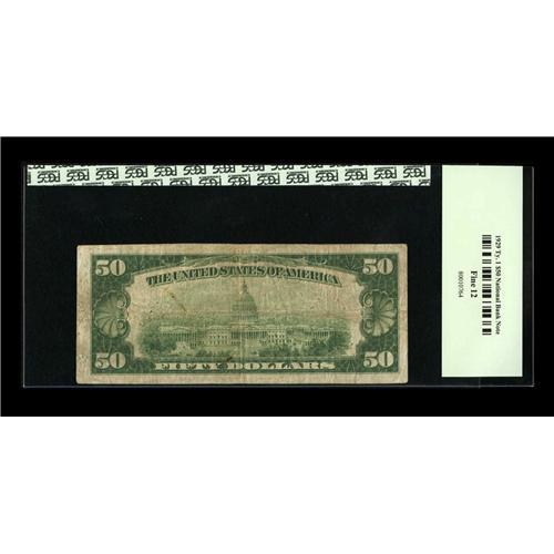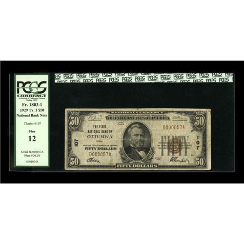 <B>Ottumwa, IA</B></I> - $50 1929 Ty. 1 <B>The First NB</B></I> Ch. # 107<BR>Although only 13 banks in the entire state issued this type and denomination, all three from this Wapello County locale did. The 1929 issue of each consisted only of the $50 and $100 Type 1. <B>PCGS Fine 12.</B></I>
