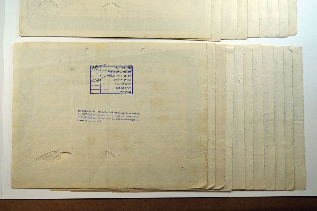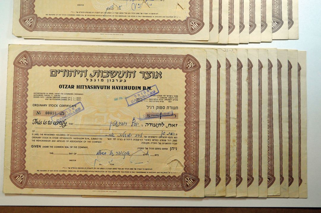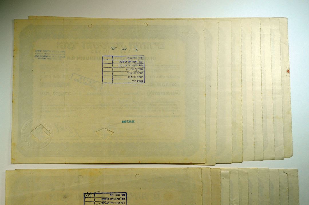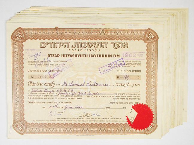 Israel…. Lot of 20 I/C certificates with Punch Holes at top and are cut cancelled. (Also the signature areas may have cut outs.) Brown border with no vignette. Printed in English and Hebrew. VF/VF+ condition. 20 Pieces.